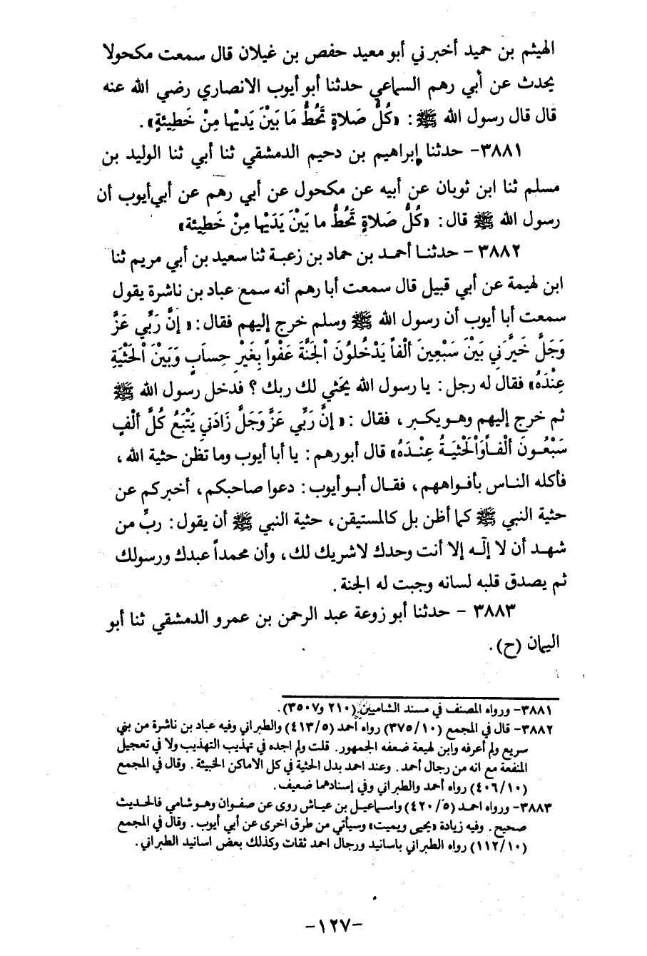 3881 - حَدَّثَنَا إِبْرَاهِيمُ بْنُ دُحَيْمٍ الدِّمَشْقِيُّ، ثنا أَبِي، ثنا الْوَلِيدُ بْنُ مُسْلِمٍ، ثنا ابْنُ ثَوْبَانَ، عَنْ أَبِيهِ، عَنْ مَكْحُولٍ، عَنْ أَبِي رُهْمٍ، عَنْ أَبِي أَيُّوبَ، أَنَّ رَسُولَ اللهِ صَلَّى اللهُ عَلَيْهِ وَسَلَّمَ قَالَ: «§كُلُّ صَلَاةٍ تَحُطُّ مَا بَيْنَ يَدَيْهَا مِنْ خَطِيئَةٍ»