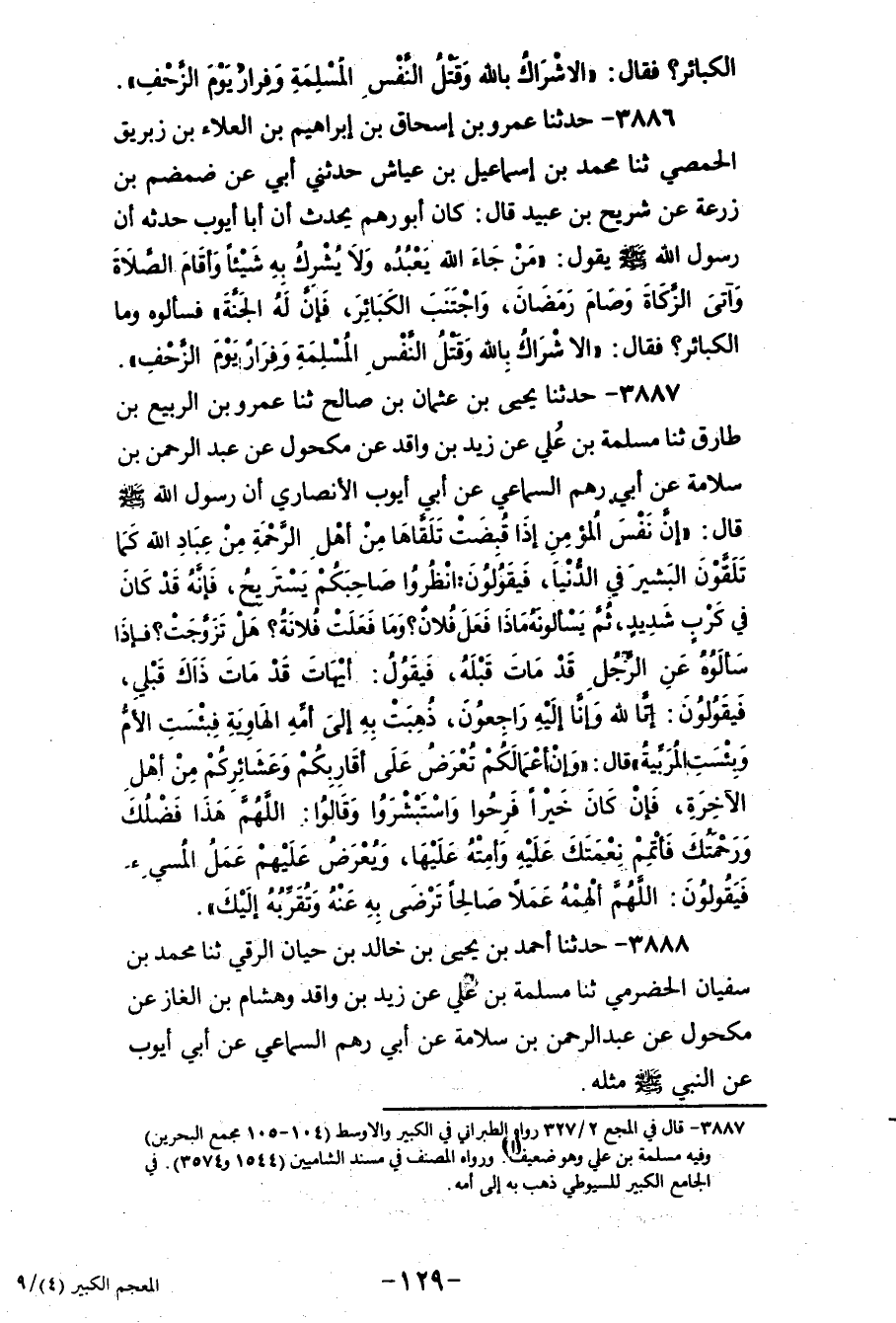 3886 - حَدَّثَنَا عَمْرُو بْنُ إِسْحَاقَ بْنِ إِبْرَاهِيمَ بْنِ الْعَلَاءِ بْنِ زِبْرِيقٍ الْحِمْصِيُّ، ثنا مُحَمَّدُ بْنُ إِسْمَاعِيلَ بْنِ عَيَّاشٍ، حَدَّثَنِي أَبِي، عَنْ ضَمْضَمِ بْنِ زُرْعَةَ، عَنْ شُرَيْحِ بْنِ عُبَيْدٍ، قَالَ: كَانَ أَبُو رُهْمٍ، يُحَدِّثُ، أَنَّ أَبَا أَيُّوبَ حَدَّثَهُ، أَنَّ رَسُولَ اللهِ صَلَّى اللهُ عَلَيْهِ وَسَلَّمَ يَقُولُ: «§مَنْ جَاءَ اللهَ يَعْبُدُهُ وَلَا يُشْرِكُ بِهِ شَيْئًا، وَأَقَامَ الصَّلَاةَ، وَآتَى الزَّكَاةَ، وَصَامَ رَمَضَانَ، وَاجْتَنَبَ الْكَبَائِرَ، فَإِنَّ لَهُ الْجَنَّةَ» ، فَسَأَلُوهُ وَمَا الْكَبَائِرُ؟ فَقَالَ: «الْإِشْرَاكُ بِاللهِ، وَقَتْلُ النَّفْسِ الْمُسْلِمَةِ، وَفِرَارٌ يَوْمَ الزَّحْفِ»