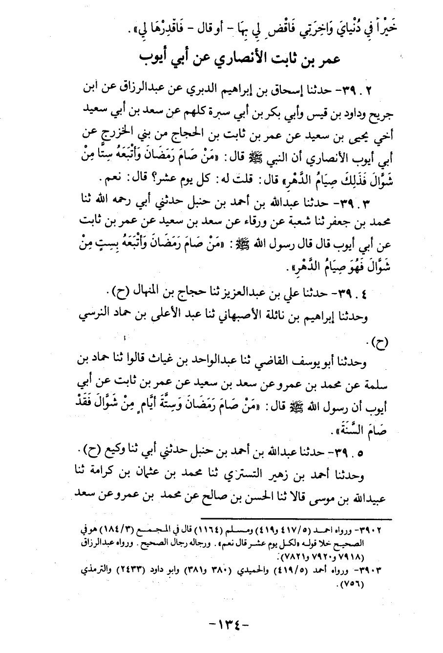 3903 - حَدَّثَنَا عَبْدُ اللهِ بْنُ أَحْمَدَ بْنِ حَنْبَلٍ، حَدَّثَنِي أَبِي رَحِمَهُ اللهُ، ثنا مُحَمَّدُ بْنُ جَعْفَرٍ، ثنا شُعْبَةُ، عَنْ وَرْقَاءَ، عَنْ سَعْدِ بْنِ سَعِيدٍ، عَنْ عُمَرَ بْنِ ثَابِتٍ، عَنْ أَبِي أَيُّوبَ، قَالَ: قَالَ رَسُولُ اللهِ صَلَّى اللهُ عَلَيْهِ وَسَلَّمَ: «§مَنْ صَامَ رَمَضَانَ، وَأَتْبَعَهُ بِسِتٍّ مِنْ شَوَّالٍ فَهُوَ صِيَامُ الدَّهْرِ»