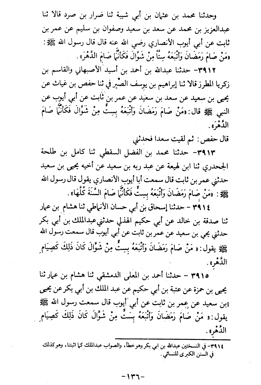 3914 - حَدَّثَنَا إِسْحَاقُ بْنُ أَبِي حَسَّانَ الْأَنْمَاطِيُّ، ثنا هِشَامُ بْنُ عَمَّارٍ، ثنا صَدَقَةُ بْنُ خَالِدٍ، عَنْ أَبِي حَكِيمٍ الْهُذَلِيِّ، حَدَّثَنِي عَبْدُ الْمَلِكِ بْنِ أَبِي بَكْرٍ، حَدَّثَنِي يَحْيَى بْنُ سَعِيدٍ، عَنْ عُمَرَ بْنِ ثَابِتٍ، عَنْ أَبِي أَيُّوبَ، قَالَ: سَمِعْتُ رَسُولَ اللهِ صَلَّى اللهُ عَلَيْهِ وَسَلَّمَ يَقُولُ: «§مَنْ صَامَ رَمَضَانَ، وَأَتْبَعَهُ بِسِتٍّ مِنْ شَوَّالٍ كَانَ ذَلِكَ كَصِيَامِ الدَّهْرِ»