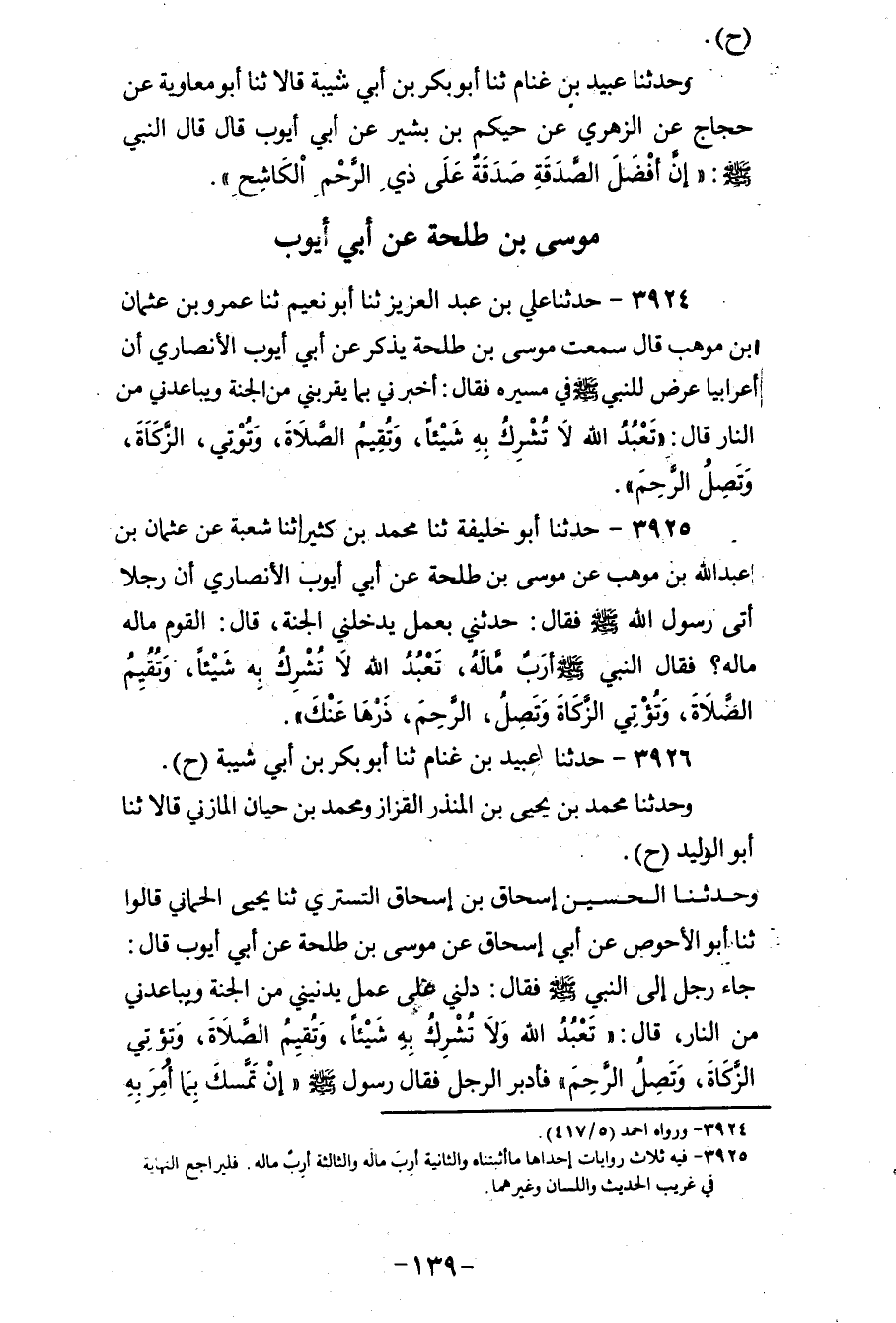 3926 - حَدَّثَنَا عُبَيْدُ بْنُ غَنَّامٍ، ثنا أَبُو بَكْرِ بْنُ أَبِي شَيْبَةَ ح، وَحَدَّثَنَا مُحَمَّدُ بْنُ يَحْيَى بْنِ الْمُنْذِرِ الْقَزَّازُ، وَمُحَمَّدُ بْنُ حَيَّانَ الْمَازِنِيُّ، قَالَا: ثنا أَبُو الْوَلِيدِ ح، وَحَدَّثَنَا الْحُسَيْنُ بْنُ إِسْحَاقَ بْنِ إِسْحَاقَ التُّسْتَرِيُّ، ثنا يَحْيَى الْحِمَّانِيُّ، قَالُوا: ثنا أَبُو الْأَحْوَصِ، عَنْ أَبِي إِسْحَاقَ، عَنْ مُوسَى بْنِ طَلْحَةَ، عَنْ أَبِي أَيُّوبَ، قَالَ: جَاءَ رَجُلٌ إِلَى النَّبِيِّ صَلَّى اللهُ عَلَيْهِ وَسَلَّمَ فَقَالَ: دُلَّنِي عَلَى عَمِلٍ يُدْنِينِي مِنَ الْجَنَّةِ وَيُبَاعِدُنِي مِنَ النَّارِ، قَالَ: «§تَعْبُدُ اللهَ وَلَا تُشْرِكُ بِهِ شَيْئًا، وَتُقِيمُ الصَّلَاةَ، وَتُؤْتِي الزَّكَاةَ، وَتَصِلُ الرَّحِمَ» ، فَأَدْبَرَ الرَّجُلُ، فَقَالَ رَسُولُ اللهِ صَلَّى اللهُ عَلَيْهِ وَسَلَّمَ: «إِنْ تَمَسَّكَ بِمَا أُمِرَ بِهِ دَخَلَ الْجَنَّةَ»