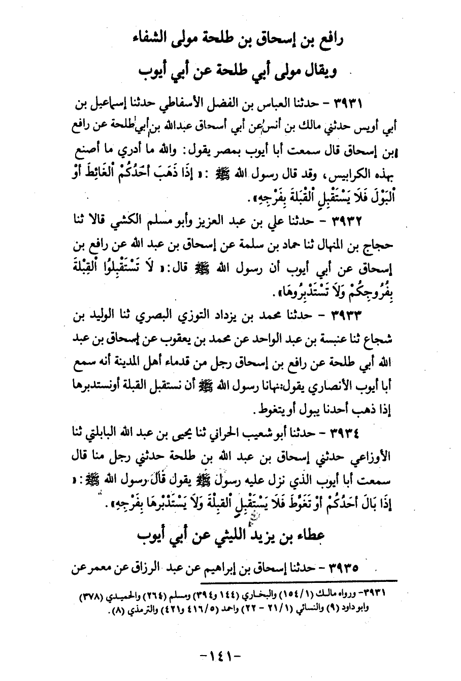 3932 - حَدَّثَنَا عَلِيُّ بْنُ عَبْدِ الْعَزِيزِ، وَأَبُو مُسْلِمٍ الْكَشِّيُّ، قَالَا: ثنا حَجَّاجُ بْنُ الْمِنْهَالِ، ثنا حَمَّادُ بْنُ سَلَمَةَ، عَنْ إِسْحَاقَ بْنِ عَبْدِ اللهِ، عَنْ رَافِعِ بْنِ إِسْحَاقَ، عَنْ أَبِي أَيُّوبَ، أَنَّ رَسُولَ اللهِ صَلَّى اللهُ عَلَيْهِ وَسَلَّمَ قَالَ: «§لَا تَسْتَقْبِلُوا الْقِبْلَةَ بِفُرُوجِكُمْ وَلَا تَسْتَدْبِرُوهَا»