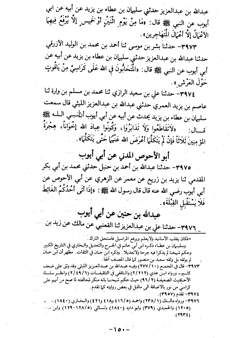 3974 - حَدَّثَنَا عَلِيُّ بْنُ سَعِيدٍ الرَّازِيُّ، ثنا مُحَمَّدُ بْنُ مُسْلِمِ بْنِ وَارَةَ، ثنا عَاصِمُ بْنُ يَزِيدَ الْعُمَرِيُّ، حَدَّثَنِي عَبْدُ اللهِ بْنُ عَبْدِ الْعَزِيزِ اللَّيْثِيُّ، قَالَ: سَمِعْتُ سُلَيْمَانَ بْنَ عَطَاءِ بْنِ يَزِيدَ، يُحَدِّثُ، عَنْ أَبِيهِ، عَنْ أَبِي أَيُّوبَ، أَنَّ نَبِيَّ اللهِ صَلَّى اللهُ عَلَيْهِ وَسَلَّمَ قَالَ: «§لَا تَقَاطَعُوا وَلَا تَدَابَرُوا وَكُونُوا عِبَادَ اللهِ إِخْوَانًا، هِجْرَةُ الْمُؤْمِنِينَ ثَلَاثًا فَإِنْ لَمْ يَتَكَلَّمَا أَعْرَضَ اللهُ عَنْهُمَا حَتَّى يَتَكَلَّمَا»