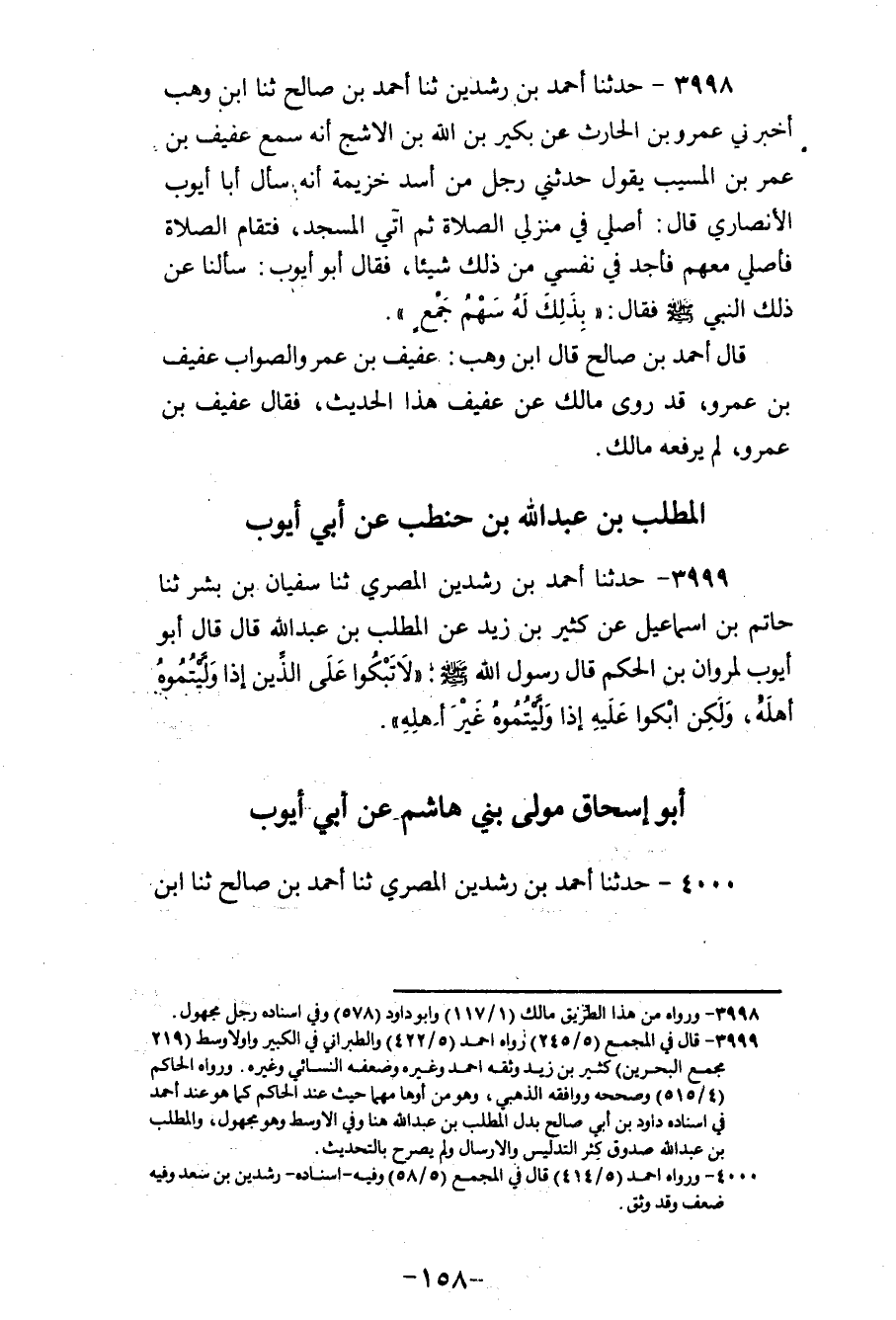3998 - حَدَّثَنَا مُطَّلِبُ بْنُ شُعَيْبٍ الْأَزْدِيُّ، ثنا عَبْدُ اللهِ بْنُ صَالِحٍ، حَدَّثَنِي اللَّيْثُ، عَنْ يَحْيَى بْنِ أَيُّوبَ، عَنْ عَمْرِو بْنِ الْحَارِثِ، عَنْ بُكَيْرِ بْنِ عَبْدِ اللهِ بْنِ الْأَشْبَحِ، عَنْ يَعْقُوبَ بْنِ عَفِيفِ بْنِ الْمُسَيَّبِ، أَنَّهُ سَأَلَ أَبَا أَيُّوبَ صَاحِبَ رَسُولِ اللهِ صَلَّى اللهُ عَلَيْهِ وَسَلَّمَ وَرَضِيَ عَنْهُ، عَنِ الرَّجُلِ يُصَلِّي فِي بَيْتِهِ، ثُمَّ يَأْتِي الْمَسْجِدَ فَيُدْرِكُ تِلْكَ الصَّلَاةَ أَيُعِيدُها مَعَ النَّاسِ أَمْ لَا؟، قَدْ سَأَلْنَا رَسُولَ اللهِ صَلَّى اللهُ عَلَيْهِ وَسَلَّمَ عَنْ ذَلِكَ، فَقَالَ: «نَعَمْ §يُعِيدُهَا ذَلِكَ لَهُ سَهْمُ جَمْعٍ»