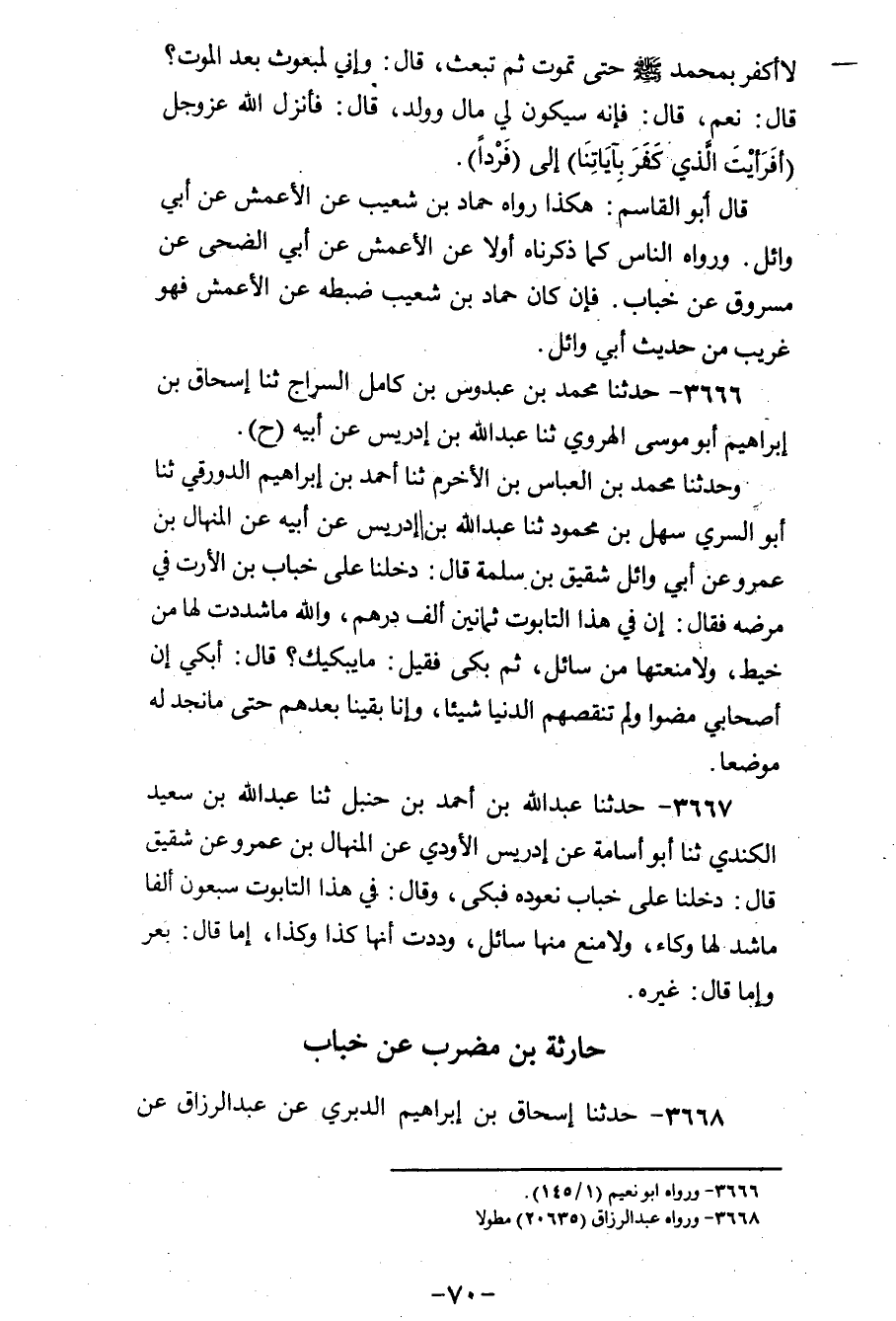3667 - حَدَّثَنَا عَبْدُ اللهِ بْنُ أَحْمَدَ بْنِ حَنْبَلٍ، ثنا عَبْدُ اللهِ بْنُ سَعِيدٍ الْكِنْدِيُّ، ثنا أَبُو أُسَامَةَ، عَنْ إِدْرِيسَ الْأَوْدِيِّ، عَنِ الْمِنْهَالِ بْنِ عَمْرٍو، عَنْ شَقِيقٍ، قَالَ: دَخَلْنَا عَلَى خَبَّابٍ نَعُودُهُ فَبَكَى، وَقَالَ: " §فِي هَذَا التَّابُوتِ سَبْعُونَ أَلْفًا مَا شُدَّ لَهَا وِكَاءٌ وَلَا مُنِعَ مِنْهَا سَائِلٌ، وَدِدْتُ أَنَّهَا كَذَا وَكَذَا، إِمَّا قَالَ: «بَعْرٌ» ، وَإِمَّا قَالَ: «غَيْرُهُ»