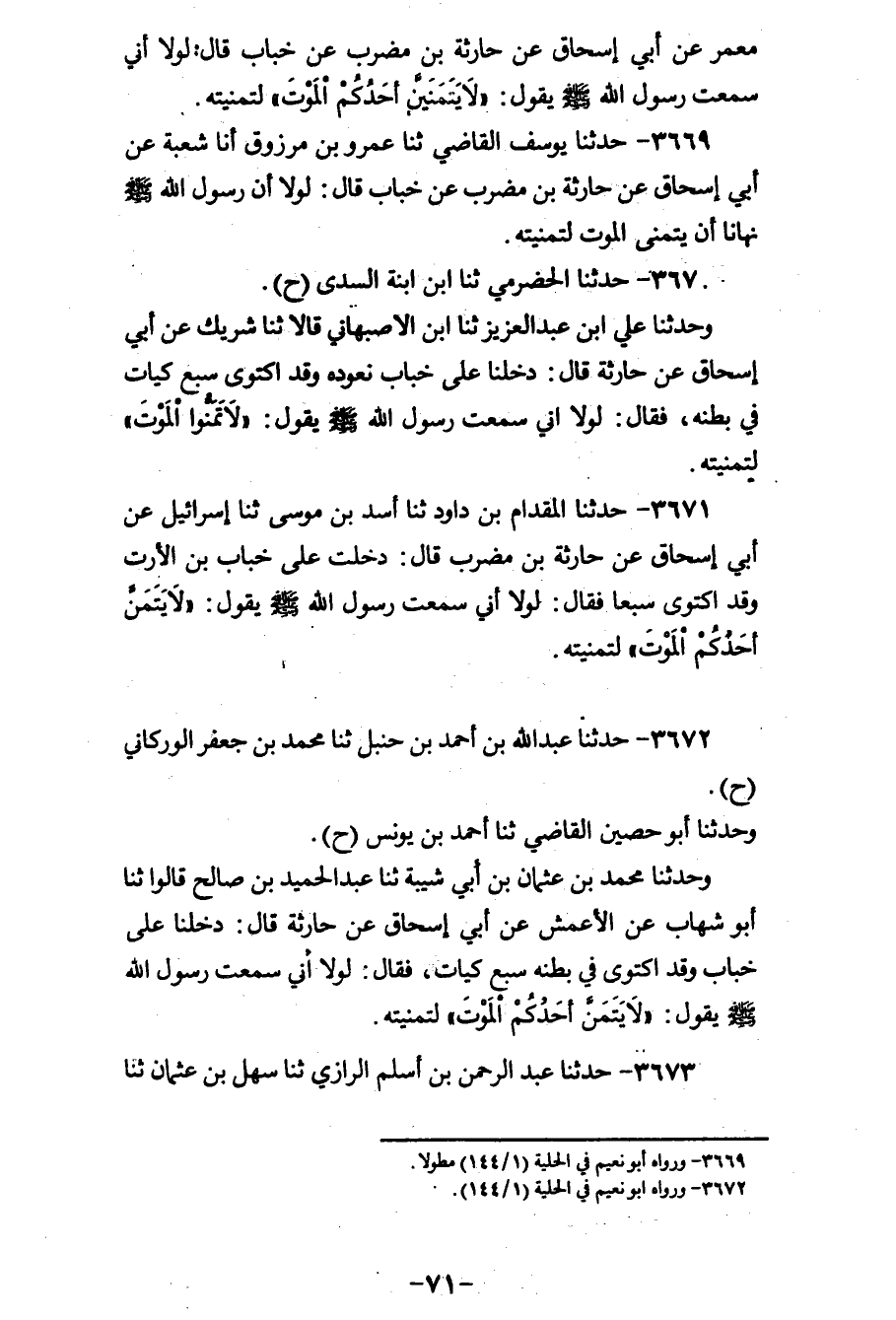 3671 - حَدَّثَنَا الْمِقْدَامُ بْنُ دَاوُدَ، ثنا أَسَدُ بْنُ مُوسَى، ثنا إِسْرَائِيلُ، عَنْ أَبِي إِسْحَاقَ، عَنْ حَارِثَةَ بْنِ مُضَرِّبٍ، قَالَ: دَخَلْتُ عَلَى خَبَّابِ بْنِ الْأَرَتِّ وَقَدِ اكْتَوَى سَبْعًا، فَقَالَ: لَوْلَا أَنِّي سَمِعْتُ رَسُولَ اللهِ صَلَّى اللهُ عَلَيْهِ وَسَلَّمَ يَقُولُ: «§لَا يَتَمَنَّ أَحَدُكُمُ الْمَوْتَ لَتَمَنَّيْتُهُ»