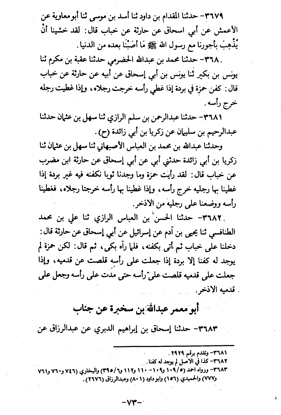 3681 - حَدَّثَنَا عَبْدُ الرَّحْمَنِ بْنُ سَلَمٍ الرَّازِيُّ، ثنا سَهْلُ بْنُ عُثْمَانَ، حَدَّثَنَا عَبْدُ الرَّحِيمِ بْنُ سُلَيْمَانَ، عَنْ زَكَرِيَّا بْنِ أَبِي زَائِدَةَ ح، وَحَدَّثَنَا عَبْدُ اللهِ بْنُ مُحَمَّدِ بْنِ الْعَبَّاسِ الْأَصْبَهَانِيُّ، ثنا سَهْلُ بْنُ عُثْمَانَ، ثنا زَكَرِيَّا بْنُ أَبِي زَائِدَةَ، حَدَّثَنِي أَبِي، عَنْ أَبِي إِسْحَاقَ، عَنْ حَارِثَةَ بْنِ مُضَرِّبٍ، عَنْ خَبَّابٍ، قَالَ: «§لَقَدْ رَأَيْتُ حَمْزَةَ وَمَا وَجَدْنَا ثَوْبًا نُكَفِّنُهُ فِيهِ غَيْرَ بُرْدَةٍ إِذَا غَطَّيْنَا بِهَا رِجْلَيْهِ خَرَجَ رَأْسُهُ، وَإِذَا غَطَّيْنَا بِهَا رَأْسَهُ خَرَجَتَا رِجْلَاهُ فَغَطَيْنَا رَأْسَهُ، وَوَضَعْنَا عَلَى رِجْلَيْهِ مِنَ الْإِذْخِرِ»