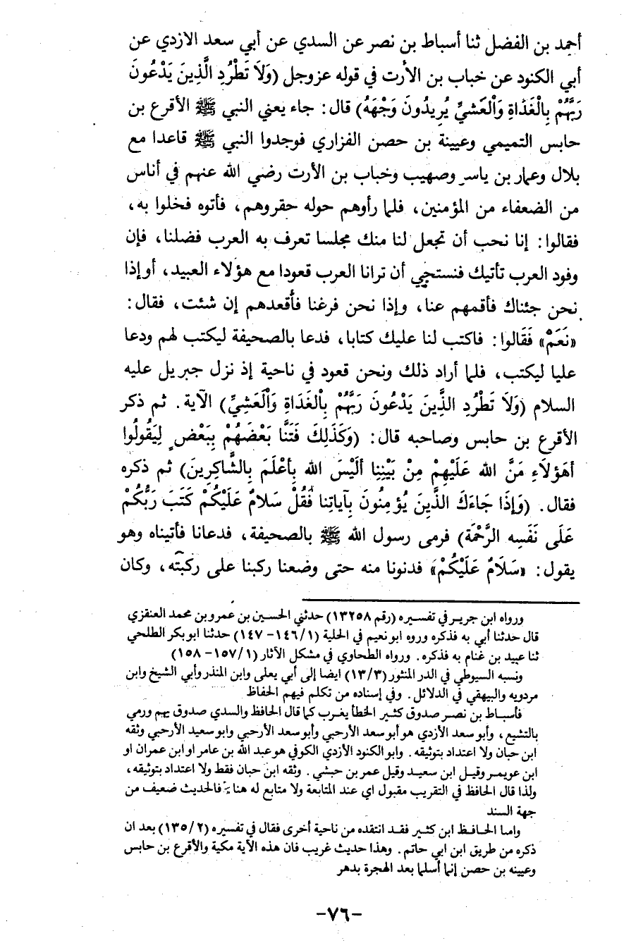 وَكَانَ رَسُولُ اللهِ صَلَّى اللهُ عَلَيْهِ وَسَلَّمَ يَجْلِسُ مَعَنَا، فَإِذَا أَرَادَ أَنْ يَقُومَ قَامَ وَتَرَكَنَا، فَأَنْزَلَ اللهُ عَزَّ وَجَلَّ: {§وَاصْبِرْ نَفْسَكَ مَعَ الَّذِينَ يَدْعُونَ رَبَّهُمْ بِالْغَدَاةِ وَالْعَشِيِّ} [الكهف: 28] يُرِيدُونَ وَجْهَهُ وَلَا تَعُدُ عَيْنَاكَ عَنْهُمْ تُرِيدُ زِينَةَ الْحَيَاةِ الدُّنْيَا يَقُولُ: لَا تُجَالِسِ الْأَشْرَافَ " {وَلَا تُطِعْ مَنْ أَغْفَلْنَا قَلْبَهُ عَنْ ذِكْرِنَا وَاتَّبَعَ هَوَاهُ وَكَانَ أَمْرُهُ فُرُطًا} [الكهف: 28] ، أَمَا الَّذِي أُغْفِلَ قَلْبُهُ فَهُوَ عُيَيْنَةُ، وَالْأَقْرَعُ بْنُ حَابِسٍ، وَأَمَّا فُرُطًا فَهَلَاكًا ثُمَّ ضَرَبَ مَثَلَ رَجُلَيْنِ وَمَثَلَ الْحَيَاةِ الدُّنْيَا قَالَ: فَكُنَّا بَعْدَ ذَلِكَ نَقْعُدُ مَعَ النَّبِيِّ صَلَّى اللهُ عَلَيْهِ وَسَلَّمَ فَإِذَا بَلَغْنَا السَّاعَةَ الَّتِي كَانَ يَقُومُ فِيهَا قُمْنَا وَتَرَكْنَاهُ حَتَّى يَقُومَ وَإِلَّا صَبَرَ حَتَّى نَقُومَ