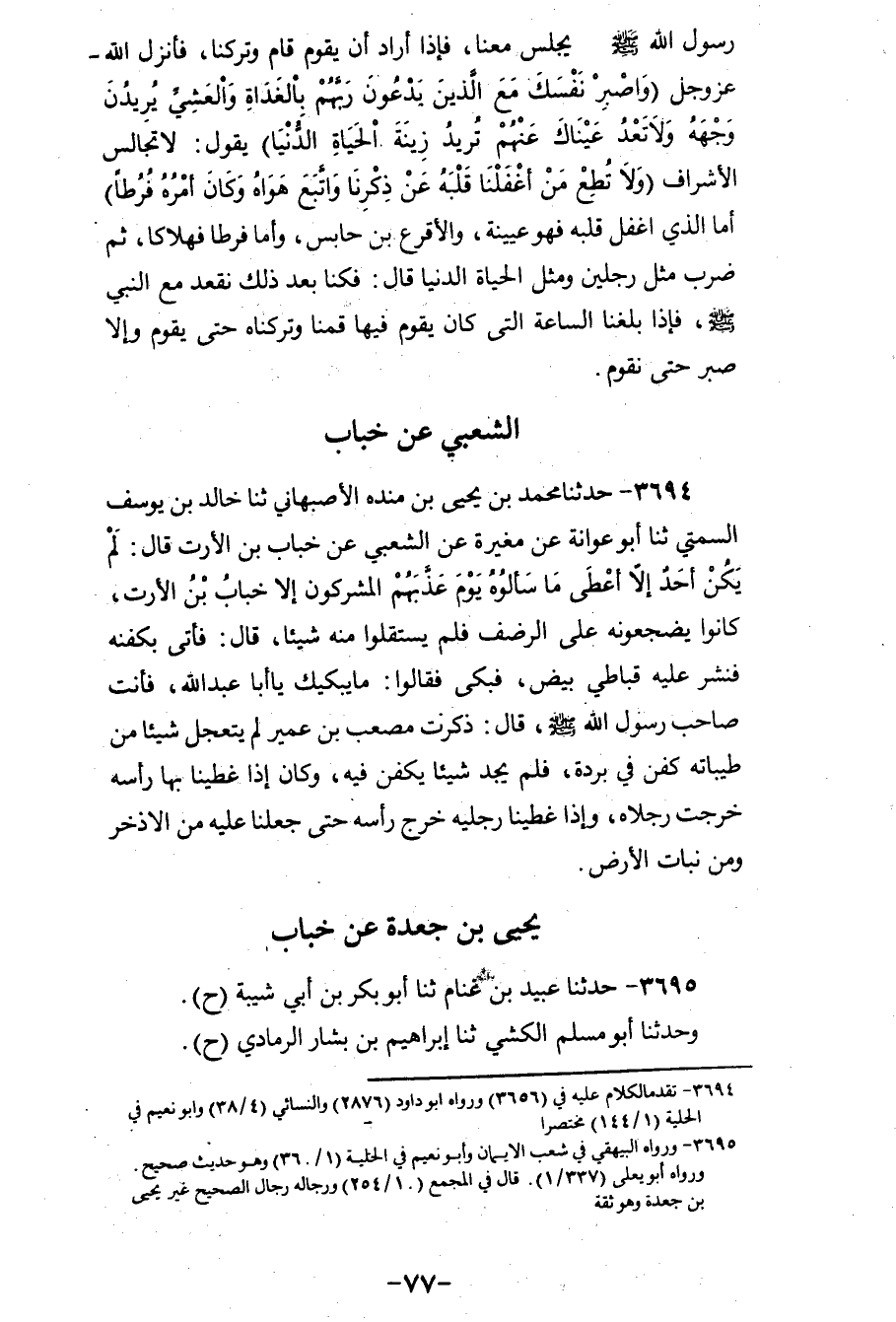 3694 - حَدَّثَنَا مُحَمَّدُ بْنُ يَحْيَى بْنِ مَنْدَهِ الْأَصْبَهَانِيُّ، ثنا خَالِدُ بْنُ يُوسُفَ السَّمْتِيُّ، ثنا أَبُو عَوَانَةَ، عَنْ مُغِيرَةَ، عَنِ الشَّعْبِيِّ، عَنْ خَبَّابِ بْنِ الْأَرَتِّ، قَالَ: لَمْ يَكُنْ أَحَدٌ إِلَّا أَعْطَى مَا سَأَلُوهُ يَوْمَ عَذَّبَهُمُ الْمُشْرِكُونَ، إِلَّا خَبَّابُ بْنُ الْأَرَتِّ كَانُوا يُضْجِعُونَهُ عَلَى الرَّضْفِ فَلَمْ يَسْتَقِلُّوا مِنْهُ شَيْئًا، قَالَ: فَأَتَى بِكَفَنِهِ فَنَشَرَ عَلَيْهِ قَبَاطِيَّ بِيضًا فَبَكَى، فَقَالُوا: مَا يُبْكِيكَ يَا أَبَا عَبْدِ اللهِ فَأَنْتَ صَاحِبُ رَسُولِ اللهِ صَلَّى اللهُ عَلَيْهِ وَسَلَّمَ؟، قَالَ: «ذَكَرْتُ مُصْعَبَ بْنَ عُمَيْرٍ §لَمْ يَتَعَجَّلُ شَيْئًا مِنْ طَيِّبَاتِهِ كُفِّنَ فِي بُرْدَةٍ، فَلَمْ يَجِدْ شَيْئًا يُكَفَّنْ فِيهِ، وَكَانَ إِذَا غَطَّيْنَا بِهَا رَأْسَهُ خَرَجَتْ رِجْلَاهُ، وَإِذَا غَطَّيْنَا رِجْلَيْهِ خَرَجَ رَأْسُهُ، حَتَّى جَعَلْنَا عَلَيْهِ مِنَ الْإِذْخِرِ وَمِنْ نَبَاتِ الْأَرْضِ»