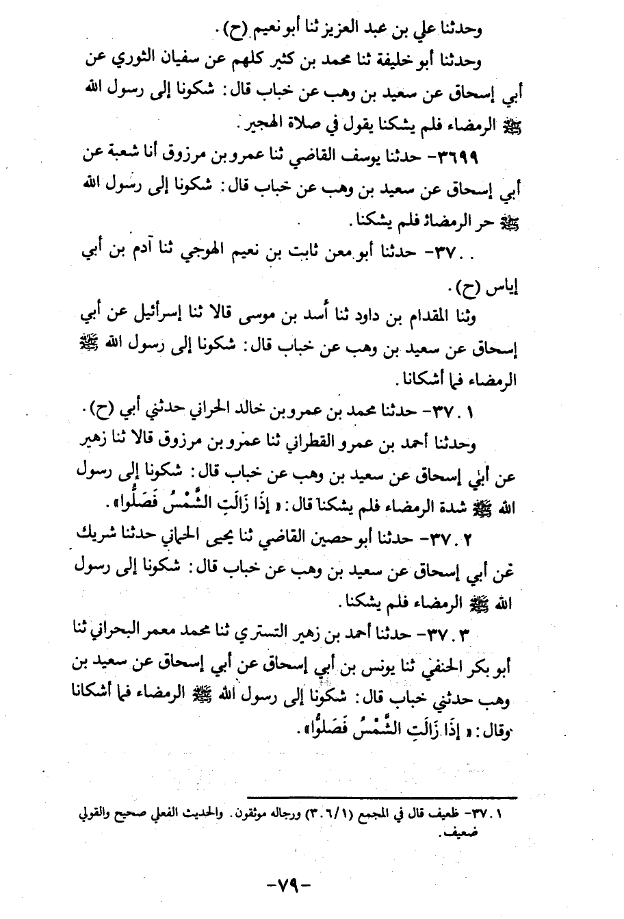 3702 - حَدَّثَنَا أَبُو حُصَيْنٍ الْقَاضِي، ثنا يَحْيَى الْحِمَّانِيُّ، حَدَّثَنَا شَرِيكٌ، عَنْ أَبِي إِسْحَاقَ، عَنْ سَعِيدِ بْنِ وَهْبٍ، عَنْ خَبَّابٍ، قَالَ: «§شَكَوْنَا إِلَى رَسُولِ اللهِ صَلَّى اللهُ عَلَيْهِ وَسَلَّمَ، الرَّمْضَاءَ فَلَمْ يُشْكِنَا»