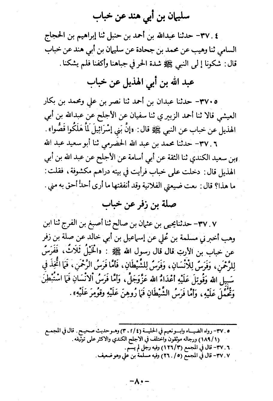 3707 - حَدَّثَنَا يَحْيَى بْنُ عُثْمَانَ بْنِ صَالِحٍ، ثنا أَصْبَغُ بْنُ الْفَرَجِ، ثنا ابْنُ وَهْبٍ، أَخْبَرَنِي مَسْلَمَةُ بْنُ عُلَيٍّ، عَنْ إِسْمَاعِيلَ بْنِ أَبِي خَالِدٍ، عَنْ صِلَةَ بْنِ زُفَرَ، عَنْ خَبَّابِ بْنِ الْأَرَتِّ، قَالَ: قَالَ رَسُولُ اللهِ صَلَّى اللهُ عَلَيْهِ وَسَلَّمَ: " §الْخَيْلُ ثَلَاثٌ فَفَرَسٌ لِلرَّحْمَنِ، وَفَرَسٌ لِلْإِنْسَانِ، وَفَرَسٌ لِلشَّيْطَانِ، فَأَمَّا فَرَسُ الرَّحْمَنِ: فَمَا اتُّخِذَ فِي سَبِيلِ اللهِ وقُوتِلَ عَلَيْهِ أَعْدَاءُ اللهِ عَزَّ وَجَلَّ، وَأَمَّا فَرَسُ الْإِنْسَانِ: فَمَا اسْتُبْطِنَ وَتُحُمِّلَ عَلَيْهِ، وَأَمَّا فَرَسُ الشَّيْطَانِ: فَمَا رُوهِنَ عَلَيْهِ وقُومِرَ عَلَيْهِ "