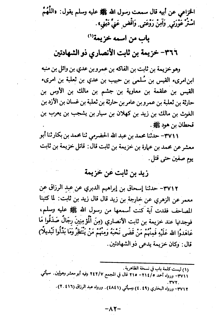 3712 - حَدَّثَنَا إِسْحَاقُ بْنُ إِبْرَاهِيمَ الدَّبَرِيُّ، عَنْ عَبْدِ الرَّزَّاقِ، عَنْ مَعْمَرٍ، عَنِ الزُّهْرِيِّ، عَنْ خَارِجَةَ بْنِ زَيْدٍ، قَالَ: قَالَ زَيْدُ بْنُ ثَابِتٍ: لَمَّا كَتَبْنَا الْمَصَاحِفَ فَقَدْتُ آيَةً كُنْتُ أَسْمَعُهَا مِنْ رَسُولِ اللهِ صَلَّى اللهُ عَلَيْهِ وَسَلَّمَ فَوَجَدْتُهَا عِنْدَ خُزَيْمَةَ بْنِ ثَابِتٍ الْأَنْصَارِيِّ " {§مِنَ الْمُؤْمِنِينَ رِجَالٌ صَدَقُوا مَا عَاهَدُوا اللهَ عَلَيْهِ فَمِنْهُمْ مَنْ قَضَى نَحْبَهُ وَمِنْهُمْ مَنْ يَنْتَظِرُ وَمَا بَدَّلُوا تَبْدِيلًا} [الأحزاب: 23] ". قَالَ: «وَكَانَ خُزَيْمَةُ يُدْعَى ذُو الشَّهَادَتَيْنِ»