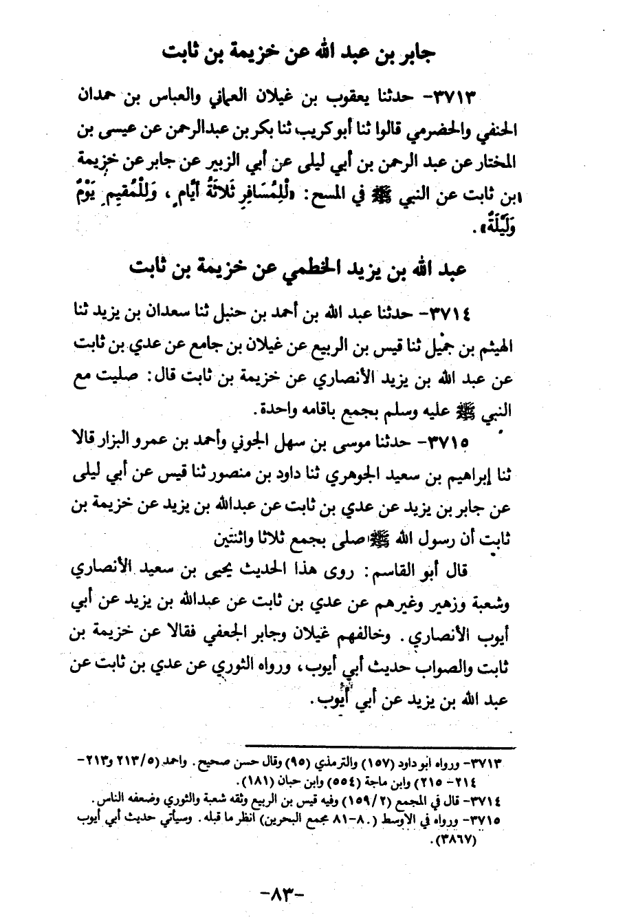 3713 - حَدَّثَنَا يَعْقُوبُ بْنُ غَيْلَانَ الْعَمَّانِيُّ وَالْعَبَّاسُ بْنُ حِمْدَانَ الْحَنَفِيُّ، وَالْحَضْرَمِيُّ، قَالُوا: ثنا أَبُو كُرَيْبٍ، ثنا بَكْرُ بْنُ عَبْدِ الرَّحْمَنِ، عَنْ عِيسَى بْنِ الْمُخْتَارِ، عَنْ عَبْدِ الرَّحْمَنِ بْنِ أَبِي لَيْلَى، عَنْ أَبِي الزُّبَيْرِ، عَنْ جَابِرٍ، عَنْ خُزَيْمَةَ بْنِ ثَابِتٍ، عَنِ النَّبِيِّ صَلَّى اللهُ عَلَيْهِ وَسَلَّمَ: «فِي §الْمَسْحِ لِلْمُسَافِرِ ثَلَاثَةُ أَيَّامٍ وَلِلْمُقِيمِ يَوْمٌ وَلَيْلَةٌ»