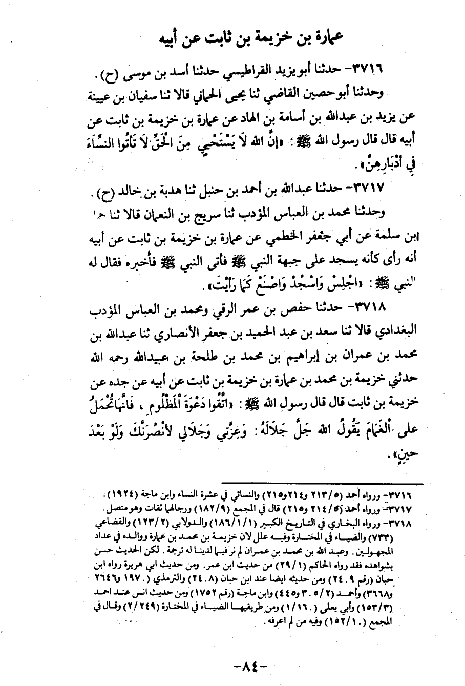 3716 - حَدَّثَنَا أَبُو يَزِيدَ الْقَرَاطِيسِيِّ، حَدَّثَنَا أَسَدُ بْنُ مُوسَى ح، وَحَدَّثَنَا أَبُو حُصَيْنٍ الْقَاضِي، ثنا يَحْيَى الْحِمَّانِيُّ، قَالَا: ثنا سُفْيَانُ بْنُ عُيَيْنَةَ، عَنْ يَزِيدِ بْنِ عَبْدِ اللهِ بْنِ أُسَامَةَ بْنِ الْهَادِ، عَنْ عُمَارَةَ بْنِ خُزَيْمَةَ بْنِ ثَابِتٍ، عَنْ أَبِيهِ، قَالَ: قَالَ رَسُولُ اللهِ صَلَّى اللهُ عَلَيْهِ وَسَلَّمَ: «إِنَّ §اللهَ لَا يَسْتَحْيِي مِنَ الْحَقِّ لَا تَأْتُوا النِّسَاءَ فِي أَدْبَارِهِنَّ»