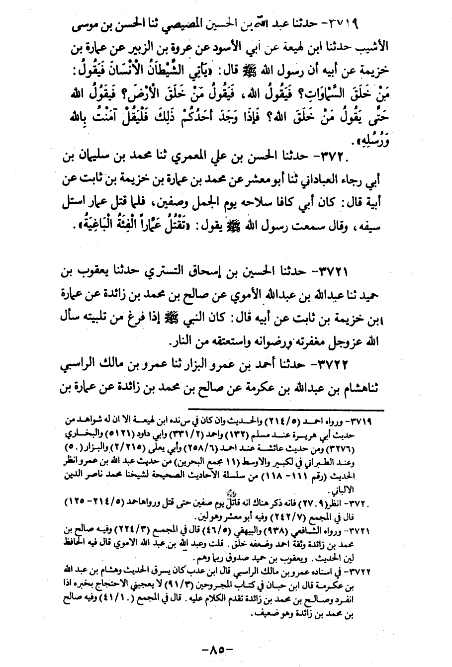3719 - حَدَّثَنَا عَبْدُ اللهِ بْنُ الْحُسَيْنِ الْمِصِّيصِيُّ، ثنا الْحَسَنُ بْنُ مُوسَى الْأَشْيَبُ، حَدَّثَنَا ابْنُ لَهِيعَةَ، عَنْ أَبِي الْأَسْوَدِ، عَنْ عُرْوَةَ بْنِ الزُّبَيْرِ، عَنْ عُمَارَةَ بْنِ خُزَيْمَةَ، عَنْ أَبِيهِ، أَنَّ رَسُولَ اللهِ صَلَّى اللهُ عَلَيْهِ وَسَلَّمَ قَالَ: " يَأْتِي الشَّيْطَانُ الْإِنْسَانَ، فَيَقُولُ: §مَنْ خَلَقَ السَّمَاوَاتِ؟ فَيَقُولُ: اللهُ، فَيَقُولُ: مَنْ خَلَقَ الْأَرْضَ؟ فَيَقُولُ: اللهُ، حَتَّى يَقُولَ: مَنْ خَلَقَ اللهَ؟ فَإِذَا وَجَدَ أَحَدُكُمْ ذَلِكَ فَلْيَقُلْ: آمَنْتُ بِاللهِ وَرُسُلِهِ "