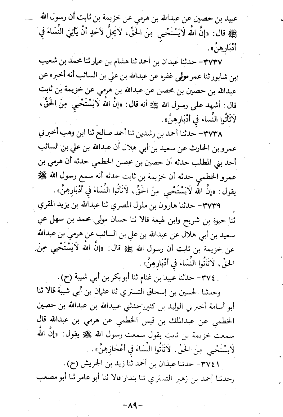 3737 - حَدَّثَنَا عَبْدَانُ بْنُ أَحْمَدَ، ثنا هِشَامُ بْنُ عَمَّارٍ، ثنا مُحَمَّدُ بْنُ شُعَيْبِ بْنِ شَابُورٍ، ثنا عُمَرُ مَوْلَى غُفْرَةَ، عَنْ عَبْدِ اللهِ بْنِ عَلِيِّ بْنِ السَّائِبِ، أَنَّهُ أَخْبَرَهُ، عَنْ عَبْدِ اللهِ بْنِ حُصَيْنِ بْنِ مِحْصَنٍ، عَنْ عَبْدِ اللهِ بْنِ هَرَمِيٍّ، عَنْ خُزَيْمَةَ بْنِ ثَابِتٍ، قَالَ: أَشْهَدُ عَلَى رَسُولِ اللهِ صَلَّى اللهُ عَلَيْهِ وَسَلَّمَ أَنَّهُ قَالَ: «إِنَّ §اللهَ لَا يَسْتَحْيِي مِنَ الْحَقِّ لَا تَأْتُوا النِّسَاءَ فِي أَدْبَارِهِنَّ»