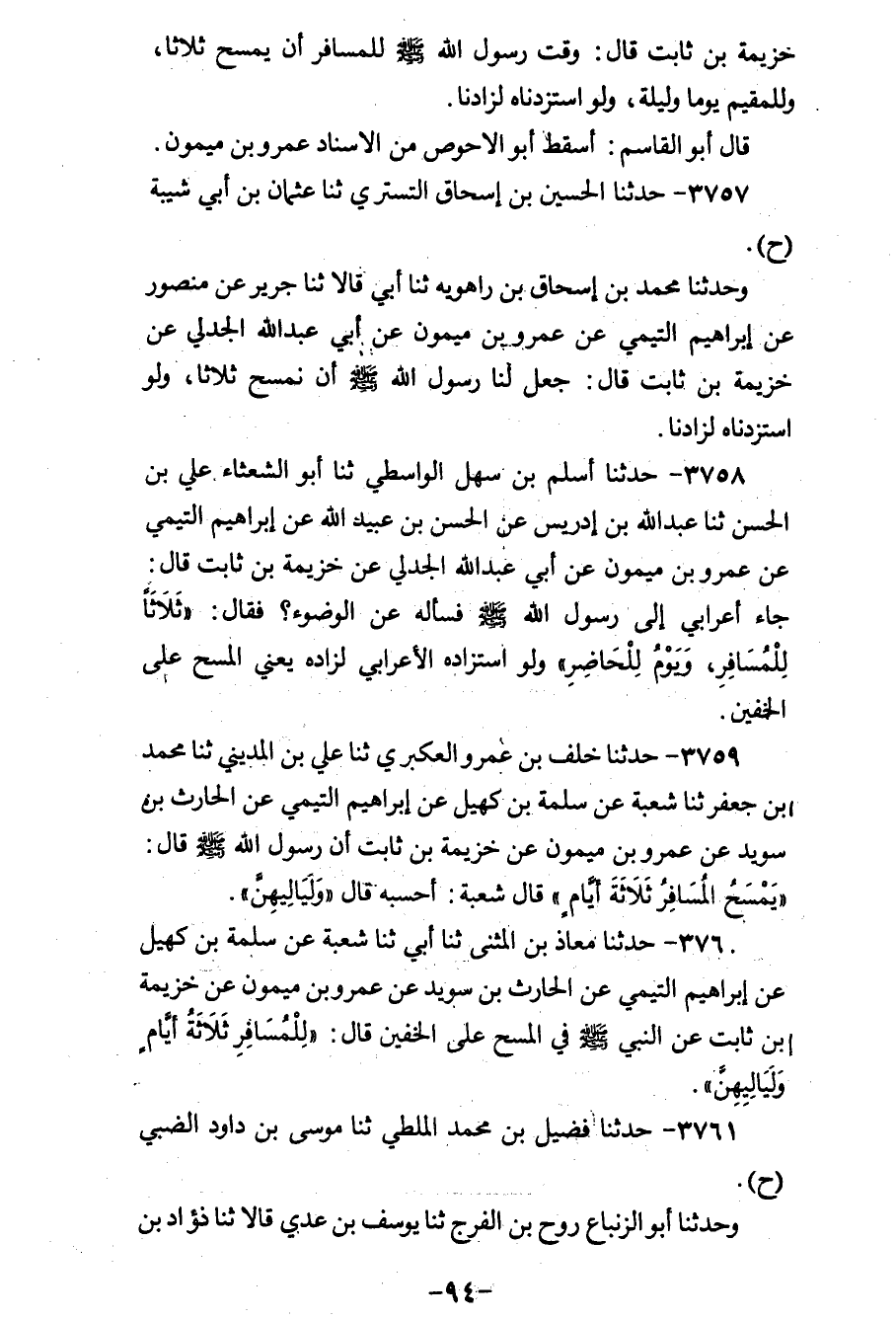 3759 - حَدَّثَنَا خَلَفُ بْنُ عَمْرٍو الْعُكْبَرِيُّ، ثنا عَلِيُّ بْنُ الْمَدِينِيِّ، ثنا مُحَمَّدُ بْنُ جَعْفَرٍ، ثنا شُعْبَةُ، عَنْ سَلَمَةَ بْنِ كُهَيْلٍ، عَنْ إِبْرَاهِيمَ التَّيْمِيِّ، عَنِ الْحَارِثِ بْنِ سُوَيْدٍ، عَنْ عَمْرِو بْنِ مَيْمُونٍ، عَنْ خُزَيْمَةَ بْنِ ثَابِتٍ، أَنَّ رَسُولَ اللهِ صَلَّى اللهُ عَلَيْهِ وَسَلَّمَ قَالَ: «§يَمْسَحُ الْمُسَافِرُ ثَلَاثَةَ أَيَّامٍ» قَالَ شُعْبَةُ: أَحْسِبُهُ قَالَ: «وَلَيَالِيهِنَّ»