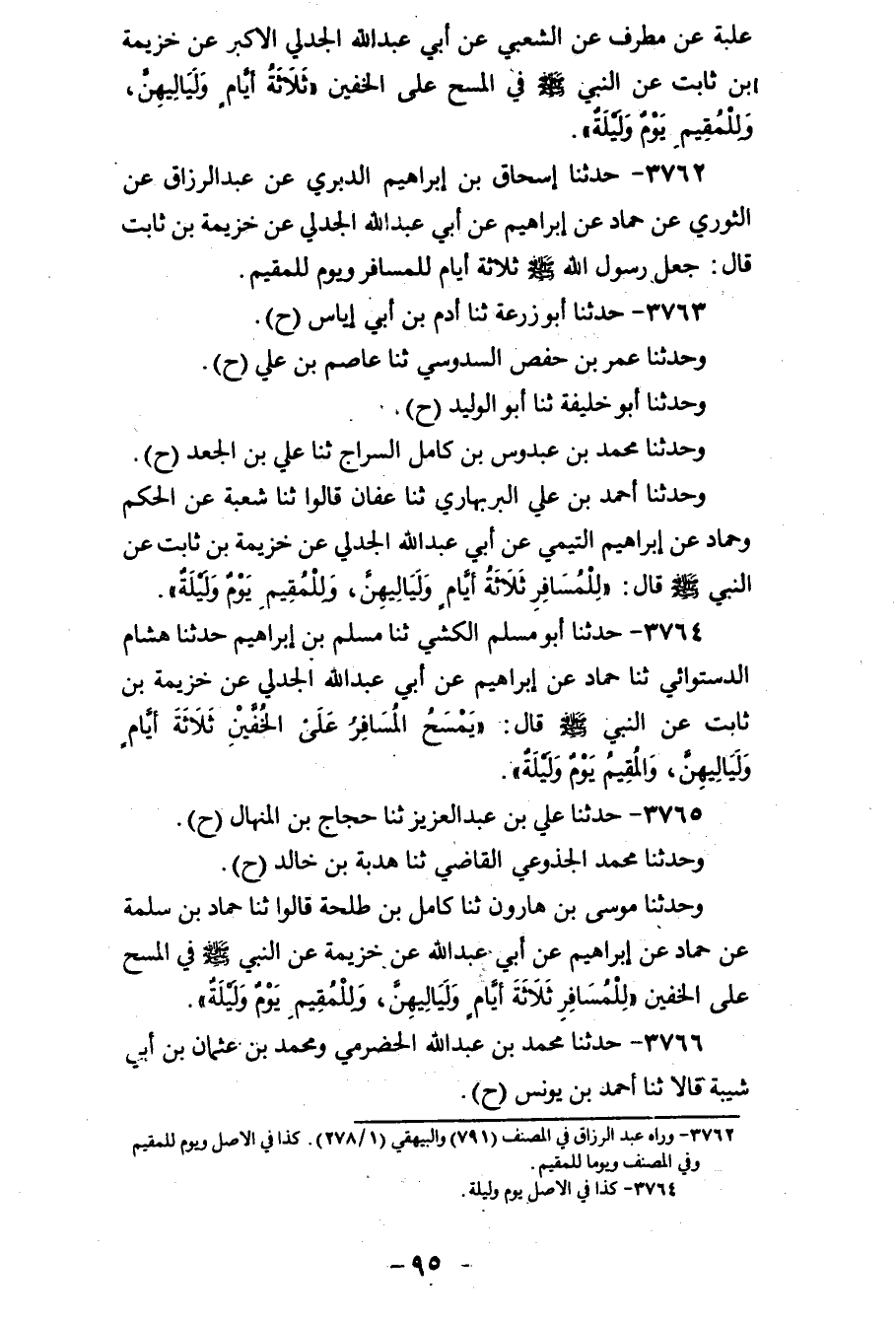 3765 - حَدَّثَنَا عَلِيُّ بْنُ عَبْدِ الْعَزِيزِ، ثنا حَجَّاجُ بْنُ الْمِنْهَالِ ح، وَحَدَّثَنَا مُحَمَّدٌ الْجَذُوعِيُّ الْقَاضِي، ثنا هُدْبَةُ بْنُ خَالِدٍ ح، وَحَدَّثَنَا مُوسَى بْنُ هَارُونَ، ثنا كَامِلُ بْنُ طَلْحَةَ، قَالُوا: ثنا حَمَّادُ بْنُ سَلَمَةَ، عَنْ حَمَّادٍ، عَنْ إِبْرَاهِيمَ، عَنْ أَبِي عَبْدِ اللهِ، عَنْ خُزَيْمَةَ، عَنِ النَّبِيِّ صَلَّى اللهُ عَلَيْهِ وَسَلَّمَ، فِي الْمَسْحِ عَلَى الْخُفَّيْنِ: «§لِلْمُسَافِرِ ثَلَاثَةُ أَيَّامٍ وَلَيَالِيهِنَّ، وَلِلْمُقِيمِ يَوْمٌ وَلَيْلَةٌ»