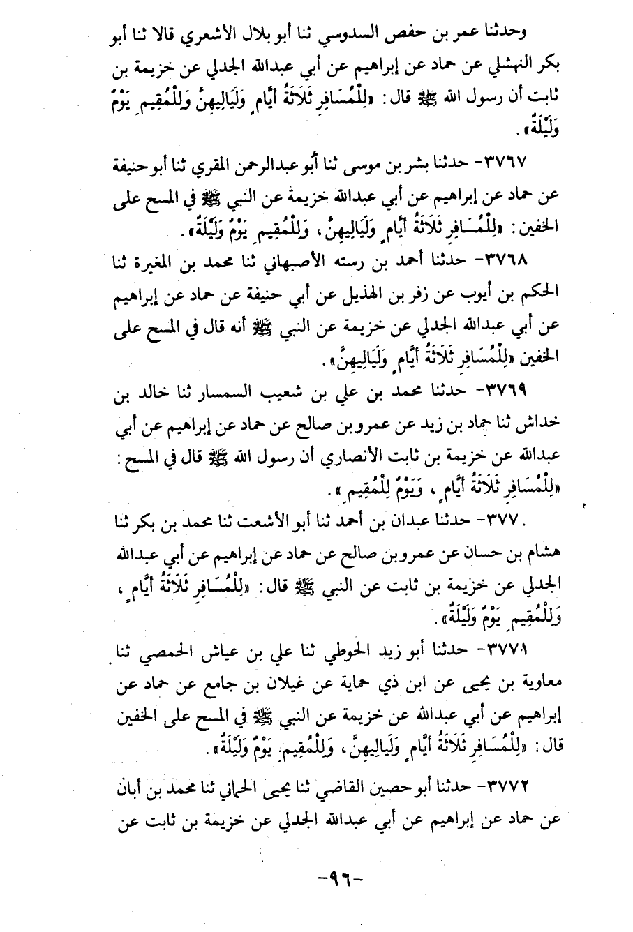 3772 - حَدَّثَنَا أَبُو حُصَيْنٍ الْقَاضِي، ثنا يَحْيَى الْحِمَّانِيُّ، ثنا مُحَمَّدُ بْنُ أَبَانَ، عَنْ حَمَّادٍ، عَنْ إِبْرَاهِيمَ، عَنْ أَبِي عَبْدِ اللهِ الْجَدَلِيِّ، عَنْ خُزَيْمَةَ بْنِ ثَابِتٍ، عَنِ النَّبِيِّ صَلَّى اللهُ عَلَيْهِ وَسَلَّمَ قَالَ: «§يَمْسَحُ الْمُسَافِرُ ثَلَاثَةَ أَيَّامٍ وَلَيَالِيهِنَّ، وَلِلْمُقِيمِ يَوْمٌ وَلَيْلَةٌ»