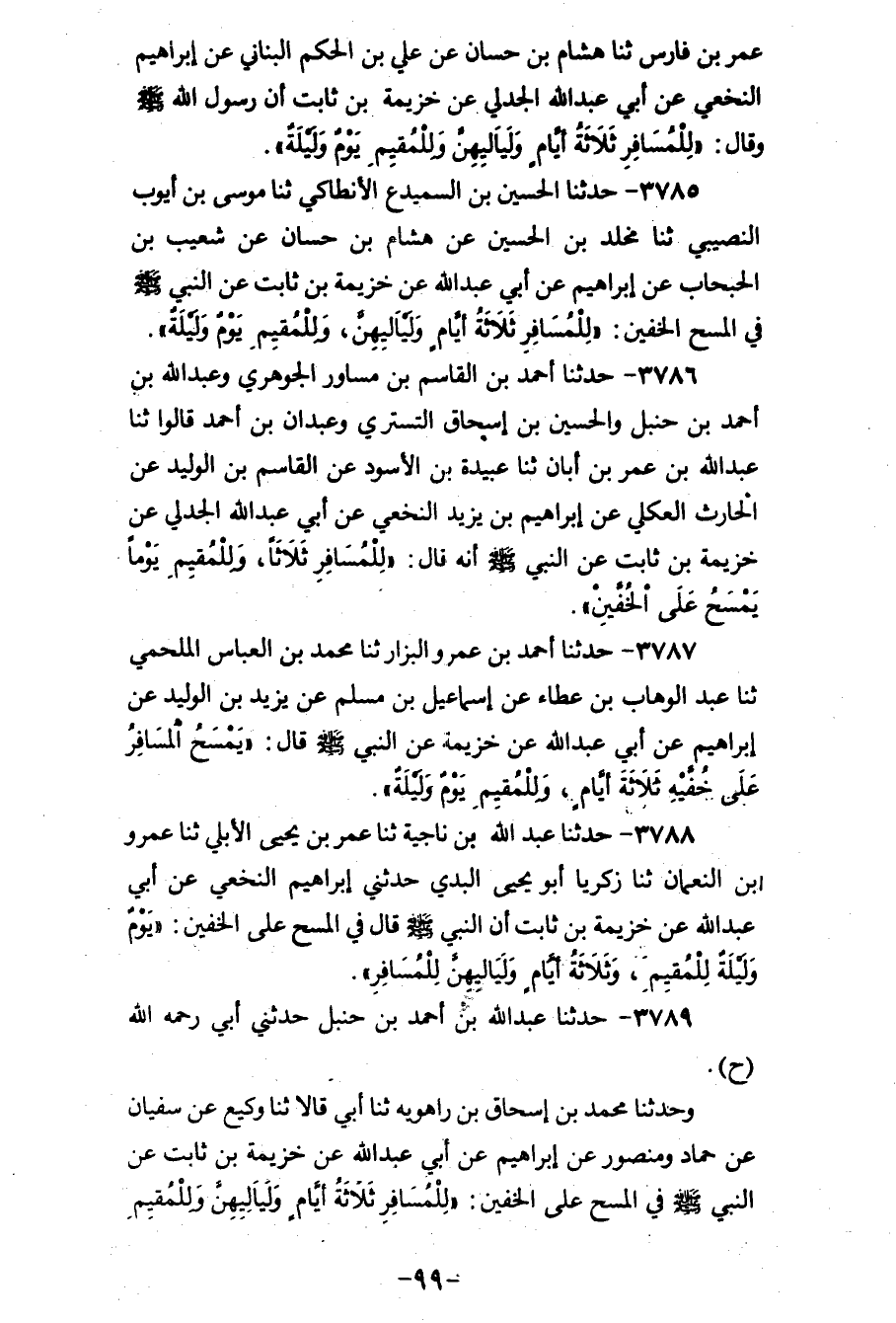 3788 - حَدَّثَنَا عَبْدُ اللهِ بْنُ نَاجِيَةَ، ثنا عُمَرُ بْنُ يَحْيَى الْأُبُلِّيُّ، ثنا عَمْرُو بْنُ النُّعْمَانِ، ثنا زَكَرِيَّا أَبُو يَحْيَى الْبُدِّيُّ، حَدَّثَنِي إِبْرَاهِيمُ النَّخَعِيُّ، عَنْ أَبِي عَبْدِ اللهِ، عَنْ خُزَيْمَةَ بْنِ ثَابِتٍ، أَنَّ النَّبِيَّ صَلَّى اللهُ عَلَيْهِ وَسَلَّمَ قَالَ فِي الْمَسْحِ عَلَى الْخُفَّيْنِ: «§يَوْمٌ وَلَيْلَةٌ لِلْمُقِيمِ، وَثَلَاثَةُ أَيَّامٍ وَلَيَالِيهِنَّ لِلْمُسَافِرِ»