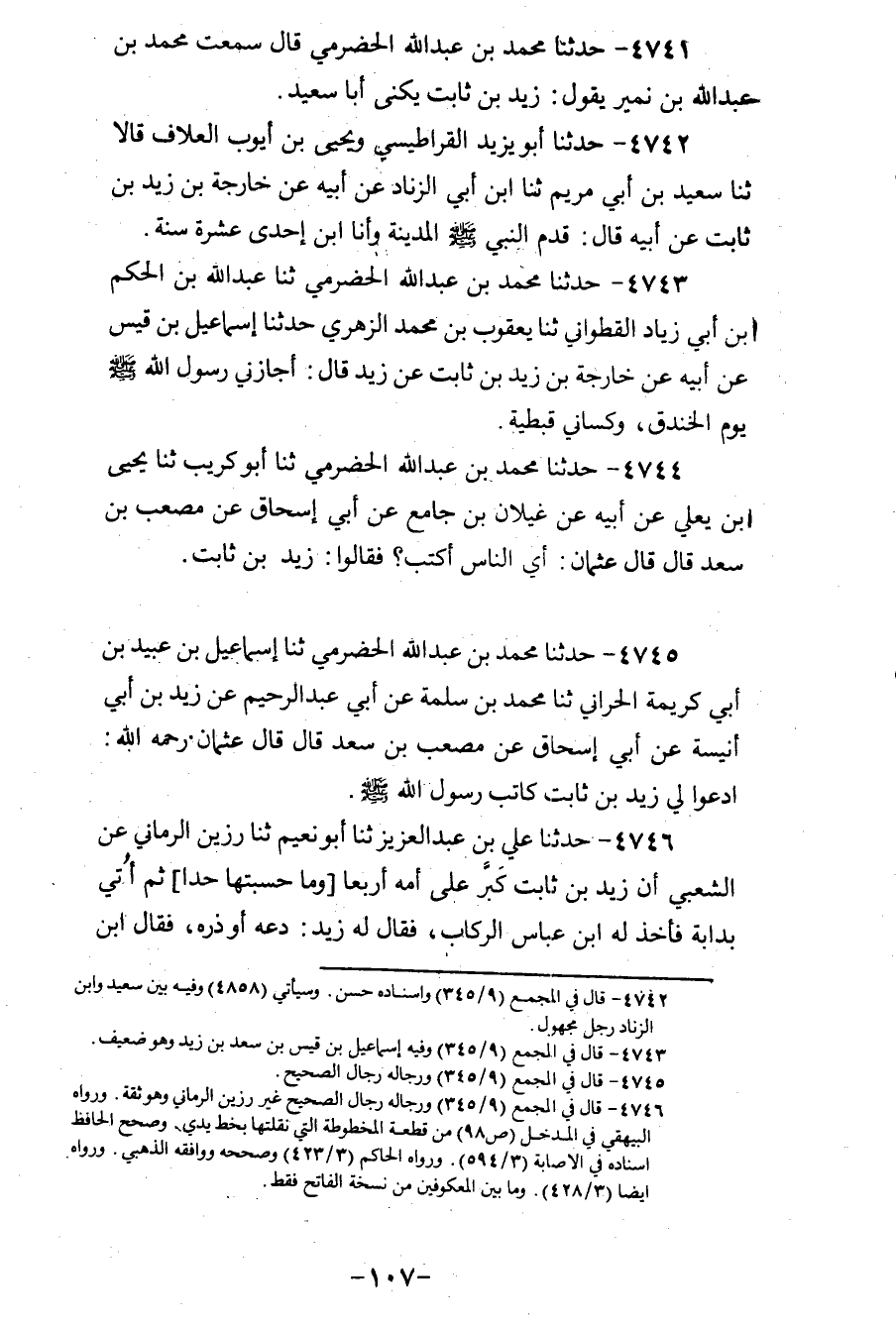4745 - حَدَّثَنَا مُحَمَّدُ بْنُ عَبْدِ اللهِ الْحَضْرَمِيُّ، ثنا إِسْمَاعِيلُ بْنُ عُبَيْدِ بْنِ أَبِي كَرِيمَةَ الْحَرَّانِيُّ، ثنا مُحَمَّدُ بْنُ سَلَمَةَ، عَنْ أَبِي عَبْدِ الرَّحِيمِ، عَنْ زَيْدِ بْنِ أَبِي أُنَيْسَةَ عَنْ أَبِي إِسْحَاقَ، عَنْ مُصْعَبِ بْنِ سَعْدٍ قَالَ: قَالَ عُثْمَانُ، رَحِمَهُ اللهُ: «§ادْعُوا لِي زَيْدَ بْنَ ثَابِتٍ كَاتَبَ رَسُولِ اللهِ صَلَّى اللهُ عَلَيْهِ وَسَلَّمَ»