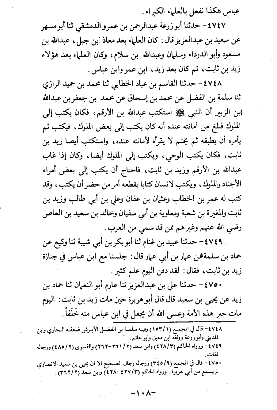 4747 - حَدَّثَنَا أَبُو زُرْعَةَ عَبْدُ الرَّحْمَنِ بْنِ عَمْرٍو الدِّمَشْقِيُّ، ثنا أَبُو مُسْهِرٍ، عَنْ سَعِيدِ بْنِ عَبْدِ الْعَزِيزِ قَالَ: «§كَانَ الْعُلَمَاءُ بَعْدَ مُعَاذِ بْنِ جَبَلٍ عَبْدُ اللهِ بْنُ مَسْعُودٍ، وَأَبُو الدَّرْدَاءِ وَسَلْمَانُ وَعَبْدُ اللهِ بْنُ سَلَامٍ، وَكَانَ الْعُلَمَاءُ بَعْدَ هَؤُلَاءِ زَيْدُ بْنُ ثَابِتٍ، ثُمَّ كَانَ بَعْدَ زَيْدٍ، ابْنُ عُمَرَ وَابْنُ عَبَّاسٍ»