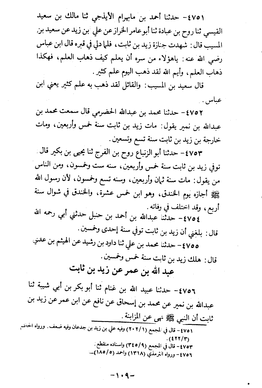 4754 - حَدَّثَنَا عَبْدُ اللهِ بْنُ أَحْمَدَ بْنِ حَنْبَلٍ، حَدَّثَنِي أَبِي رَحِمَهُ اللهُ قَالَ: «بَلَغَنِي أَنَّ §زَيْدَ بْنَ ثَابِتٍ تُوُفِّيَ سَنَةَ إِحْدَى وَخَمْسِينَ»