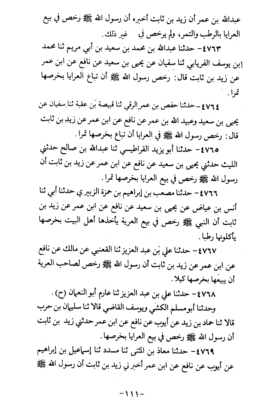 4764 - حَدَّثَنَا حَفْصُ بْنُ عُمَرَ الرَّقِّيُّ، ثنا قَبِيصَةُ بْنُ عُقْبَةَ، ثنا سُفْيَانُ، عَنْ يَحْيَى بْنِ سَعِيدٍ، وَعُبَيْدِ اللهِ بْنِ عُمَرَ، عَنْ نَافِعٍ، عَنِ ابْنِ عُمَرَ، عَنْ زَيْدِ بْنِ ثَابِتٍ قَالَ: «§رَخَّصَ رَسُولُ اللهِ صَلَّى اللهُ عَلَيْهِ وَسَلَّمَ فِي الْعَرَايَا أَنْ تُبَاعَ بِخَرْصِهَا تَمْرًا»