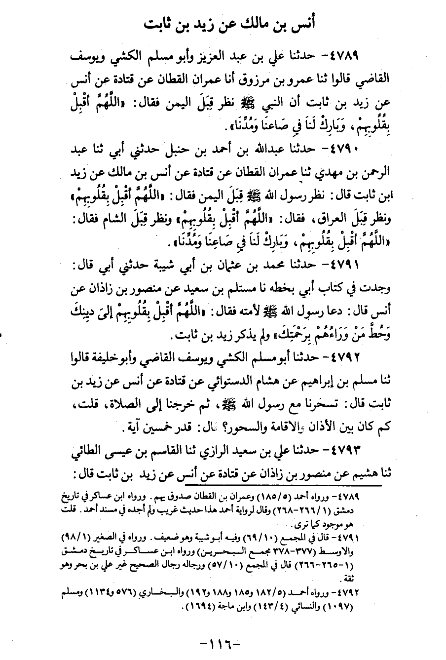 4790 - حَدَّثَنَا عَبْدُ اللهِ بْنُ أَحْمَدَ بْنِ حَنْبَلٍ، حَدَّثَنِي أَبِي، ثنا عَبْدُ الرَّحْمَنِ بْنُ مَهْدِيُّ، ثنا عِمْرَانُ الْقَطَّانُ، عَنْ قَتَادَةَ، عَنْ أَنَسِ بْنِ مَالِكٍ، عَنْ زَيْدِ بْنِ ثَابِتٍ، قَالَ: نَظَرَ رَسُولُ اللهِ صَلَّى اللهُ عَلَيْهِ وَسَلَّمَ قِبَلَ الْيَمَنِ فَقَالَ: «§اللهُمَّ أَقْبِلْ بِقُلُوبِهِمْ» وَنَظَرَ قِبَلَ الْعِرَاقِ فَقَالَ: «اللهُمَّ أَقْبِلْ بِقُلُوبِهِمْ» وَنَظَرَ قِبَلَ الشَّامِ فَقَالَ: «اللهُمَّ أَقْبِلْ بِقُلُوبِهِمْ، وَبَارِكْ لَنَا فِي صَاعِنَا وَمُدِّنَا»