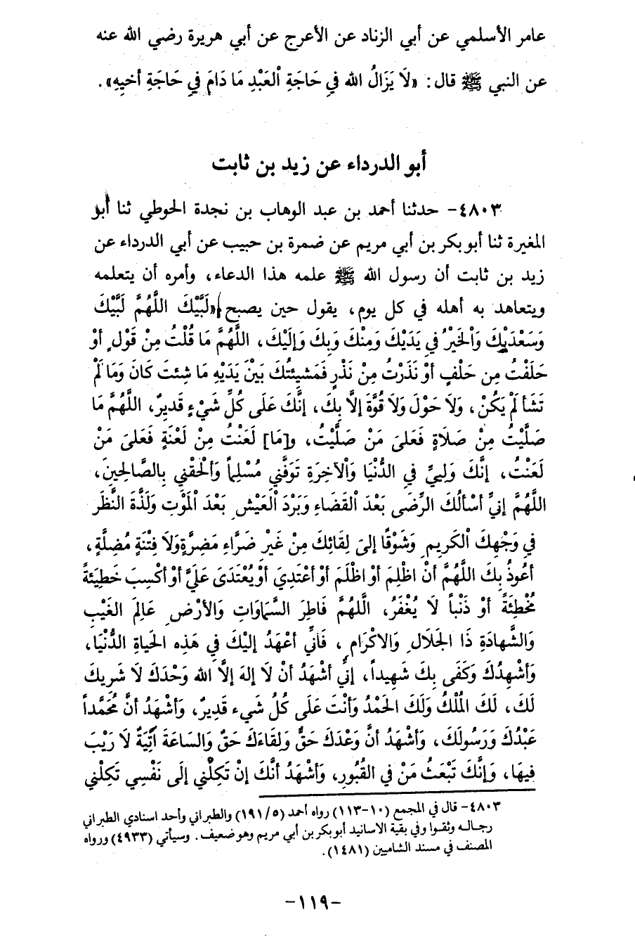 4803 - حَدَّثَنَا أَحْمَدُ بْنُ عَبْدِ الْوَهَّابِ بْنِ نَجْدَةَ الْحَوْطِيُّ، ثنا أَبُو الْمُغِيرَةِ، ثنا أَبُو بَكْرِ بْنُ أَبِي مَرْيَمَ، عَنْ ضَمْرَةَ بْنِ حَبِيبٍ، عَنْ أَبِي الدَّرْدَاءِ، عَنْ زَيْدِ بْنِ ثَابِتٍ، أَنَّ رَسُولَ اللهِ صَلَّى اللهُ عَلَيْهِ وَسَلَّمَ عَلَّمَهُ هَذَا الدُّعَاءَ، وَأَمَرَهُ أَنْ يَتَعَلَّمُهُ ويَتَعَاهَدَ بِهِ أَهْلَهُ فِي كُلِّ يَوْمٍ، يَقُولُ حِينَ يُصْبِحُ: «§لَبَّيْكَ اللهُمَّ لَبَّيْكَ وَسَعْدَيْكَ وَالْخَيْرُ فِي يَدَيْكَ وَمِنْكَ وَبِكَ وَإِلَيْكَ، اللهُمَّ مَا قُلْتُ مِنْ قَوْلٍ أَوْ حَلَفْتُ مِنْ حَلَفٍ أَوْ نَذَرْتُ مِنْ نَذْرٍ فَمَشِيئَتُكَ بَيْنَ يَدَيْهِ مَا شِئْتَ كَانَ وَمَا لَمْ تَشَأْ لَمْ يَكُنْ، وَلَا حَوْلَ وَلَا قُوَّةَ إِلَّا بِكَ، إِنَّكَ عَلَى كُلِّ شَيْءٍ قَدِيرٍ، اللهُمَّ مَا صَلَّيْتُ مِنْ صَلَاةٍ فَعَلَى مَنْ صَلَّيْتَ، وَمَا لَعَنْتَ مِنْ لعْنَةٍ فَعَلَى مَنْ لَعَنْتَ، إِنَّكَ وَلِيٌّ فِي الدُّنْيَا وَالْآخِرَةِ تَوَفَّنِي مُسْلِمًا وَأَلْحِقْنِي بِالصَّالِحِينَ، اللهُمَّ إِنِّي أَسْأَلُكُ الرِّضَى بَعْدَ الْقَضَاءِ وَبَرْدَ الْعَيْشِ بَعْدَ الْمَوْتِ وَلَذَّةَ النَّظَرِ فِي وَجْهِكَ الْكَرِيمِ وَشَوْقًا إِلَى لِقَائِكَ مِنْ غَيْرِ ضَرَّاءَ مُضِرَّةٍ وَلَا فِتْنَةٍ مُضِلَّةٍ، أَعُوذُ بِكَ اللهُمَّ أَنْ أَظْلِمَ أَوْ أُظْلَمَ أَوْ أَعْتَدِيَ أَوْ يُعْتَدَى عَلِيَّ أَوْ أكْسِبَ خَطِيئَةً مُخْطِئَةً أَوْ ذَنْبًا لَا يُغْفَرُ، اللهُمَّ فَاطِرَ السَّمَاوَاتِ وَالْأَرْضِ عَالِمَ الْغَيْبِ وَالشَّهَادَةِ ذَا الْجَلَالِ وَالْإِكْرَامِ، فَإِنِّي أَعْهَدُ إِلَيْكَ فِي هَذِهِ الْحَيَاةِ الدُّنْيَا، وَأُشْهِدُكَ وَكَفَى بِكَ شَهِيدًا، إِنِّي أَشْهَدُ أَنَّ لَا إِلَهَ إِلَّا اللهُ وَحْدَكَ لَا شَرِيكَ لَكَ، لَكَ الْمُلْكُ وَلَكَ الْحَمْدُ وَأَنْتَ عَلَى كُلِّ شَيْءٍ قَدِيرٍ، وَأَشْهَدُ أَنَّ مُحَمَّدًا عَبْدُكَ وَرَسُولُكَ، وَأَشْهَدُ أَنَّ وَعْدَكَ حَقٌّ وَلِقَاءَكَ حَقٌّ وَالسَّاعَةَ آتِيَةٌ لَا رَيْبَ فِيهَا، وَإِنَّكَ تَبْعَثُ مَنْ فِي الْقُبُورِ، وَأَشْهَدُ أَنَّكَ إِنْ تَكِلْنِي إِلَى نَفْسِي تَكِلْنِي إِلَى ضِعْفٍ وَعَوْرَةٍ وَذَنْبٍ وَخَلَلٍ وَخَطِيئَةٍ، وَإِنِّي لَا أَثِقُ إِلَّا بِرَحْمَتِكَ وَاغْفِرْ لِي ذَنْبِي كُلَّهُ، إِنَّهُ لَا يَغْفِرُ الذُّنُوبَ إِلَّا أَنْتَ وَتُبْ عَلِيَّ إِنَّكَ أَنْتَ التَّوَّابُ الرَّحِيمُ»