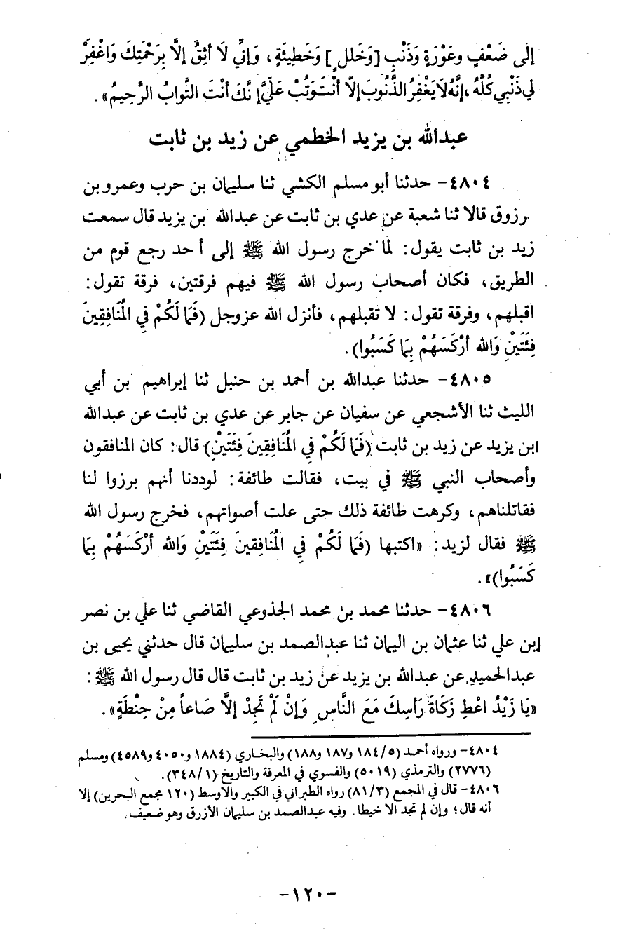 4804 - حَدَّثَنَا أَبُو مُسْلِمٍ الْكَشِّيُّ، ثنا سُلَيْمَانُ بْنُ حَرْبٍ، وَعَمْرُو بْنُ مَرْزُوقٍ، قَالَا: ثنا شُعْبَةُ، عَنْ عَدِيِّ بْنِ ثَابِتٍ، عَنْ عَبْدِ اللهِ بْنِ يَزِيدَ قَالَ: سَمِعْتُ زَيْدُ بْنُ ثَابِتٍ يَقُولُ: " §لَمَّا خَرَجَ رَسُولُ اللهِ صَلَّى اللهُ عَلَيْهِ وَسَلَّمَ إِلَى أُحُدٍ رَجَعَ قَوْمٌ مِنَ الطَّرِيقِ، فَكَانَ أَصْحَابُ رَسُولِ اللهِ صَلَّى اللهُ عَلَيْهِ وَسَلَّمَ فِيهِمْ فِرْقَتَيْنِ، فِرْقَةٌ تَقُولُ: اقْبَلْهُمْ، وَفِرْقَةٌ تَقُولُ: لَا تَقْبَلْهُمْ " فَأَنْزَلَ اللهُ عَزَّ وَجَلَّ {فَمَا لَكُمْ فِي الْمُنَافِقِينَ فِئَتَيْنِ وَاللهُ أَرْكَسَهُمْ بِمَا كَسَبُوا} [النساء: 88]
