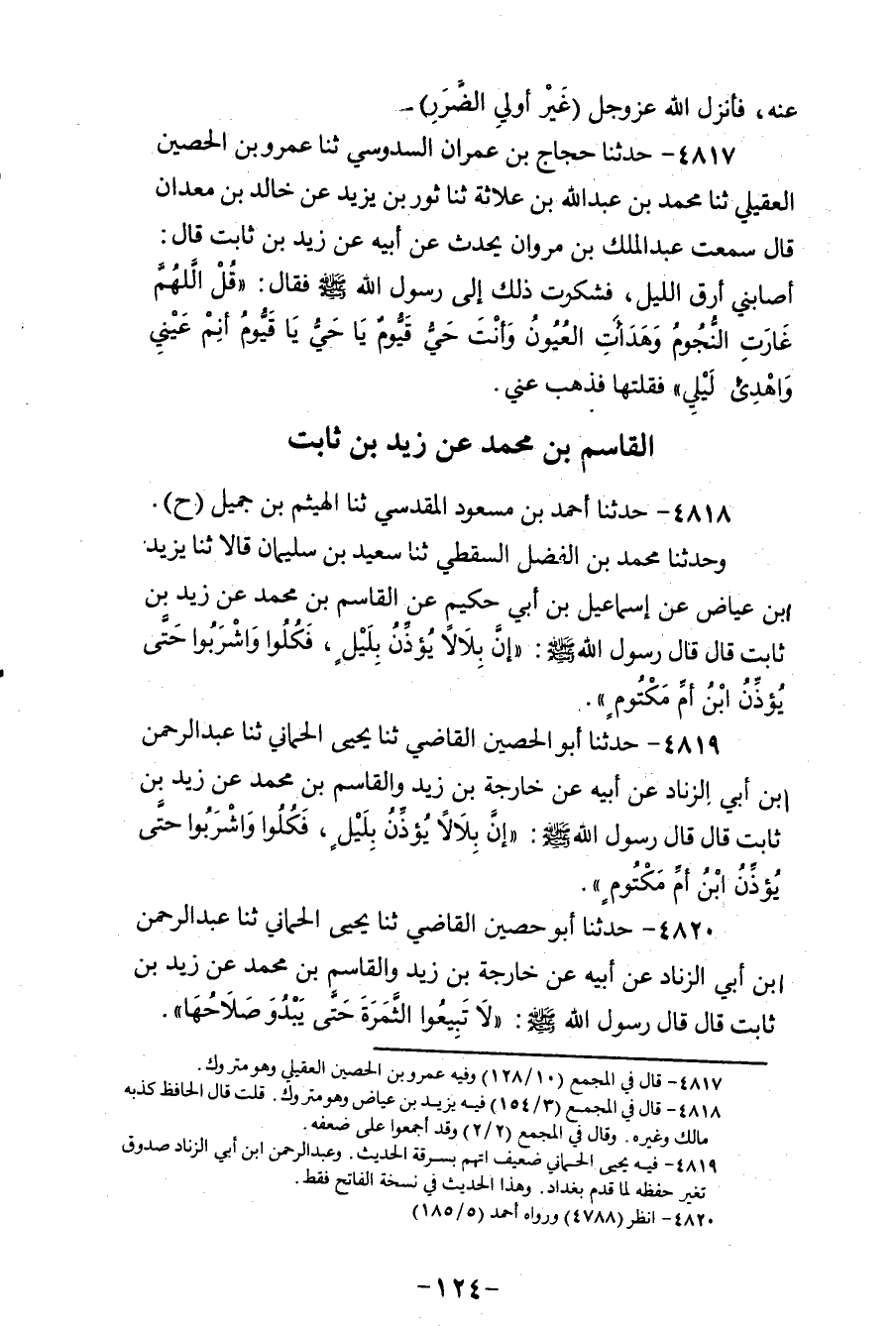 4818 - حَدَّثَنَا أَحْمَدُ بْنُ مَسْعُودٍ الْمَقْدِسِيُّ، ثنا الْهَيْثَمُ بْنُ جَمِيلٍ، ح وَحَدَّثَنَا مُحَمَّدُ بْنُ الْفَضْلِ السَّقَطِيُّ، ثنا سَعِيدُ بْنُ سُلَيْمَانَ، قَالَا ثنا يَزِيدُ بْنُ عِيَاضٍ، عَنْ إِسْمَاعِيلَ بْنِ أَبِي حَكِيمٍ، عَنِ الْقَاسِمِ بْنِ مُحَمَّدٍ، عَنْ زَيْدِ بْنِ ثَابِتٍ، قَالَ: قَالَ رَسُولُ اللهِ صَلَّى اللهُ عَلَيْهِ وَسَلَّمَ: «§إِنَّ بِلَالًا يُؤَذِّنُ بِلَيْلٍ، فَكُلُوا وَاشْرَبُوا حَتَّى يُؤَذِّنَ ابْنُ أُمِّ مَكْتُومٍ»
