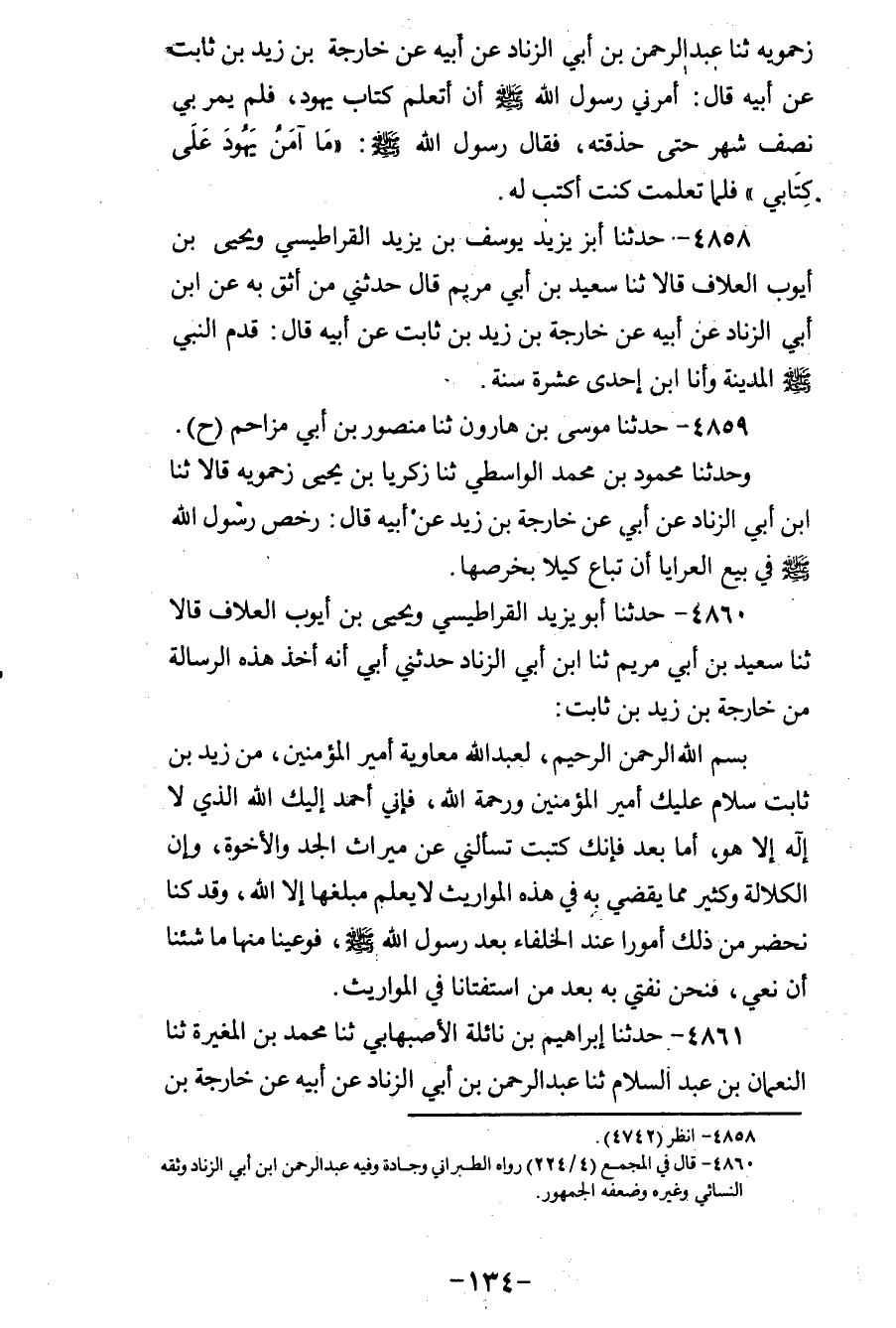 4860 - حَدَّثَنَا أَبُو يَزِيدَ الْقَرَاطِيسِيُّ، وَيَحْيَى بْنُ أَيُّوبَ الْعَلَّافُ، قَالَا: ثنا سَعِيدُ بْنُ أَبِي مَرْيَمَ، ثنا ابْنُ أَبِي الزِّنَادِ، حَدَّثَنِي أَبِي، أَنَّهُ أَخَذَ هَذِهِ الرِّسَالَةَ مِنْ خَارِجَةَ بْنِ زَيْدِ بْنِ ثَابِتٍ بِسْمِ اللهِ الرَّحْمَنِ الرَّحِيمِ لِعَبْدِ اللهِ مُعَاوِيَةَ أَمِيرِ الْمُؤْمِنِينَ مِنْ زَيْدِ بْنِ ثَابِتٍ «§سَلَامٌ عَلَيْكَ أَمِيرَ الْمُؤْمِنِينَ وَرَحْمَةُ اللهِ فَإِنِّي أَحْمَدُ إِلَيْكَ اللهَ الَّذِي لَا إِلَهَ إِلَّا هُوَ أَمَا بَعْدُ فَإِنَّكَ كَتَبْتَ تَسْأَلُنِي عَنْ مِيرَاثِ الْجَدِّ وَالْأُخْوَةِ وَإِنَّ الْكَلَالَةَ وَكَثِيرًا مِمَّا يُقْضَى بِهِ فِي هَذِهِ الْمَوَارِيثِ لَا يَعْلَمُ مَبْلَغُهَا إِلَّا اللهُ وَقَدْ كُنَّا نَحْضُرُ مِنْ ذَلِكَ أُمُورًا عِنْدَ الْخُلَفَاءِ بَعْدَ رَسُولِ اللهِ صَلَّى اللهُ عَلَيْهِ وَسَلَّمَ فَوَعِينَا مِنْهَا مَا شِئْنَا أَنْ نَعِيَ فَنَحْنُ نُفْتِي بِهِ بَعْدُ مَنِ اسْتَفْتَانَا فِي الْمَوَارِيثِ»