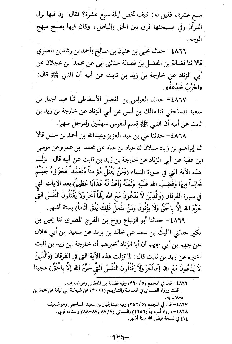 4866 - حَدَّثَنَا يَحْيَى بْنُ عُثْمَانَ بْنِ صَالِحٍ، وَأَحْمَدُ بْنُ رِشْدِينَ الْمِصْرِيُّ قَالَا: ثنا فَضَالَةُ بْنُ الْمُفَضَّلِ بْنِ فَضَالَةَ، حَدَّثَنِي أَبِي، عَنْ مُحَمَّدِ بْنِ عَجْلَانَ عَنْ أَبِي الزِّنَادِ، عَنْ خَارِجَةَ بْنِ زَيْدِ بْنِ ثَابِتٍ، عَنْ أَبِيهِ: أَنَّ النَّبِيَّ صَلَّى اللهُ عَلَيْهِ وَسَلَّمَ قَالَ: «§الْحَرْبُ خَدْعَةٌ»