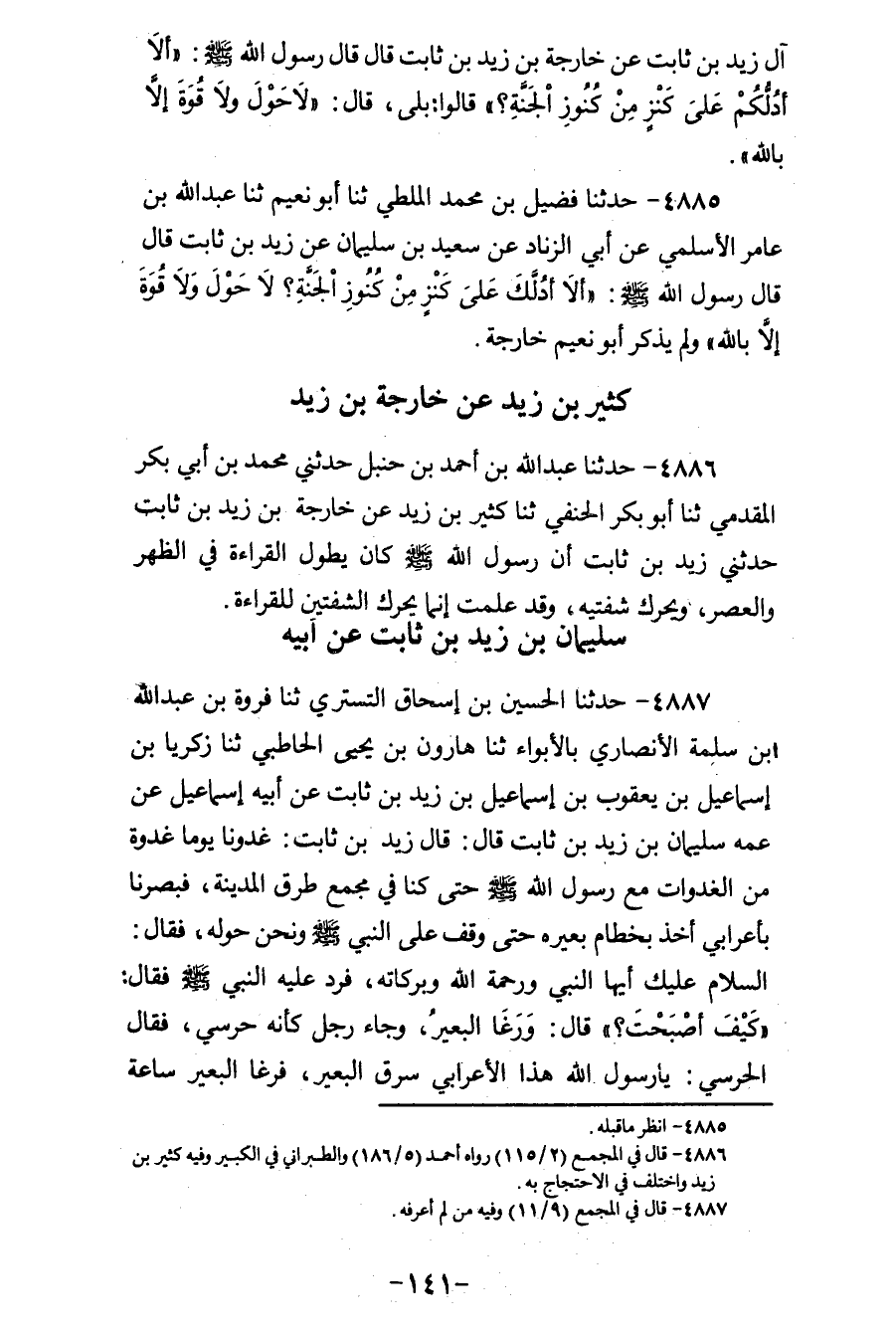 4885 - حَدَّثَنَا فُضَيْلُ بْنُ مُحَمَّدٍ الْمَلْطِيُّ، ثنا أَبُو نُعَيْمٍ، ثنا عَبْدُ اللهِ بْنُ عَامِرٍ الْأَسْلَمِيُّ، عَنْ أَبِي الزِّنَادِ، عَنْ سَعِيدِ بْنِ سُلَيْمَانَ، عَنْ زَيْدِ بْنِ ثَابِتٍ، قَالَ: قَالَ رَسُولُ اللهِ صَلَّى اللهُ عَلَيْهِ وَسَلَّمَ: «§أَلَا أَدُلُّكَ عَلَى كَنْزٍ مِنْ كُنُوزِ الْجَنَّةِ لَا حَوْلَ وَلَا قُوَّةَ إِلَّا بِاللهِ» وَلَمْ يَذْكُرْ أَبُو نُعَيْمٍ خَارِجَةَ