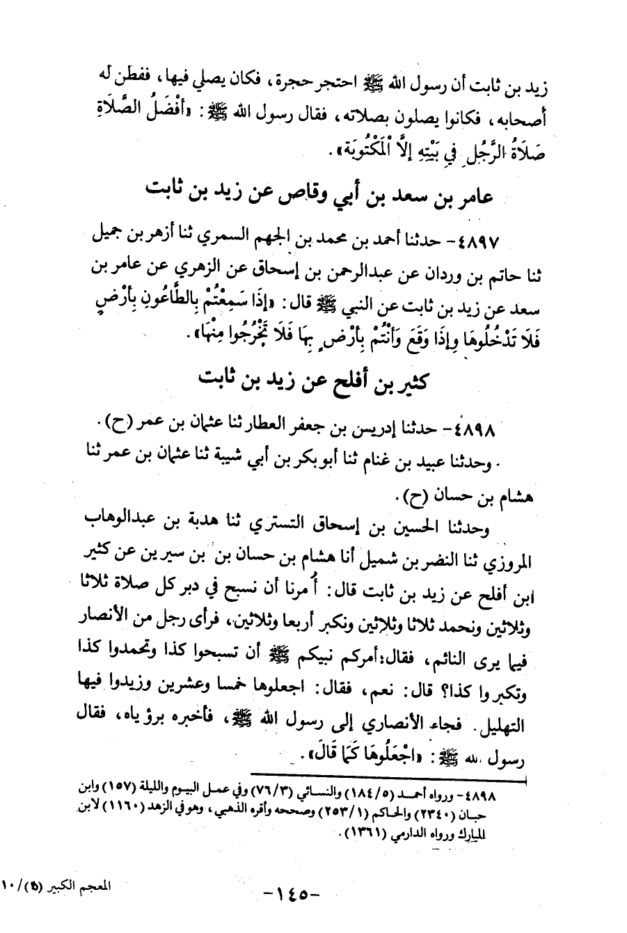4898 - حَدَّثَنَا إِدْرِيسُ بْنُ جَعْفَرٍ الْعَطَّارُ، ثنا عُثْمَانُ بْنُ عُمَرَ، ح وَحَدَّثَنَا عُبَيْدُ بْنُ غَنَّامٍ، ثنا أَبُو بَكْرِ بْنُ أَبِي شَيْبَةَ، ثنا عُثْمَانُ بْنُ عُمَرَ، ثنا هِشَامُ بْنُ حَسَّانَ، ح وَحَدَّثَنَا الْحُسَيْنُ بْنُ إِسْحَاقَ التُّسْتَرِيُّ، ثنا هَدِيَّةُ بْنُ عَبْدِ الْوَهَّابِ الْمَرْوَزِيُّ، ثنا النَّضْرُ بْنُ شُمَيْلٍ، أَنَا هِشَامُ بْنُ حَسَّانَ عَنِ ابْنِ سِيرِينَ، عَنْ كَثِيرِ بْنِ أَفْلَحَ، عَنْ زَيْدِ بْنِ ثَابِتٍ، قَالَ: أَمَرَنَا أَنْ نُسَبِّحَ فِي دُبُرِ كُلِّ صَلَاةٍ ثَلَاثًا وَثَلَاثِينَ وَنَحْمَدُ ثَلَاثًا وَثَلَاثِينَ وَنُكَبِّرُ أَرْبَعًا وَثَلَاثِينَ، فَرَأَى رَجُلٌ مِنَ الْأَنْصَارِ فِيمَا يَرَى النَّائِمُ، فَقَالَ: أَمَرَكُمْ نَبِيُّكُمْ صَلَّى اللهُ عَلَيْهِ وَسَلَّمَ أَنْ تُسَبِّحُوا كَذَا وَتَحْمَدُوا كَذَا وَتُكَبِّرُوا كَذَا قَالَ: نَعَمْ، فَقَالَ: «اجْعَلُوهَا خَمْسًا وَعِشْرِينَ وَزِيدُوا فِيهَا التَّهْلِيلَ» ، فَجَاءَ الْأَنْصَارِيُّ إِلَى رَسُولِ اللهِ صَلَّى اللهُ عَلَيْهِ وَسَلَّمَ، فَأَخْبَرَهُ بِرُؤيَاهُ، فَقَالَ رَسُولُ اللهِ صَلَّى اللهُ عَلَيْهِ وَسَلَّمَ: «§اجْعَلُوهَا كَمَا قَالَ»