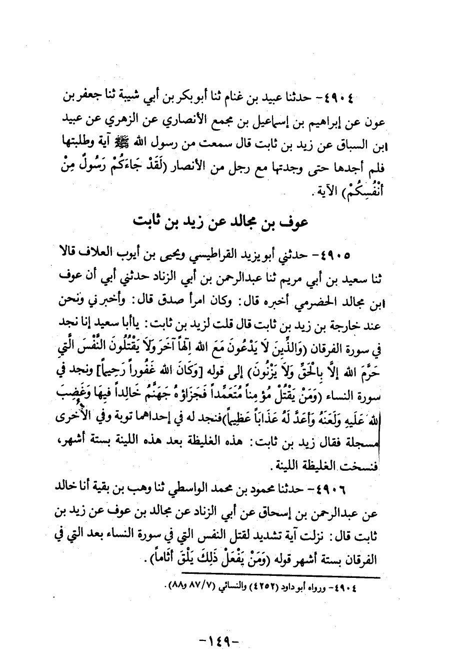 4905 - حَدَّثَنِي أَبُو يَزِيدَ الْقَرَاطِيسِيُّ، وَيَحْيَى بْنُ أَيُّوبَ الْعَلَّافُ قَالَا، ثنا سَعِيدُ بْنُ أَبِي مَرْيَمَ، ثنا عَبْدُ الرَّحْمَنِ بْنُ أَبِي الزِّنَادِ، حَدَّثَنِي أَبِي أَنَّ عَوْفَ بْنَ مُجَالِدٍ الْحَضْرَمِيُّ، أَخْبَرَهُ قَالَ: وَكَانَ امْرَأَ صِدْقٍ قَالَ: وَأَخْبَرَنِي وَنَحْنُ عِنْدَ خَارِجَةَ بْنِ زَيْدِ بْنِ ثَابِتٍ، قَالَ: قُلْتُ لِزَيْدِ بْنِ ثَابِتٍ: يَا أَبَا سَعِيدٍ، إِنَّا نَجْدُ فِي سُورَةِ الْفُرْقَانِ {وَالَّذِينَ لَا يَدْعُونَ مَعَ اللهِ إِلَهًا آخَرَ وَلَا يَقْتُلُونَ النَّفْسَ الَّتِي حَرَّمَ اللهُ إِلَّا بِالْحَقِّ وَلَا يَزْنُونَ} [الفرقان: 68]- إِلَى قَوْلِهِ - {وَكَانَ اللهُ غَفُورًا رَحِيمًا} [النساء: 96] ونَجِدُ فِي سُورَةِ النِّسَاءِ {وَمَنْ يَقْتُلْ مُؤْمِنًا مُتَعَمِّدًا فَجَزَاؤُهُ جَهَنَّمُ خَالِدًا فِيهَا وَغَضِبَ اللهُ عَلَيْهِ وَلعَنَهُ وَأَعَدَّ لَهُ عَذَابًا عَظِيمًا} [النساء: 93] فَنَجِدُ لَهُ فِي إِحْدَاهُمَا تَوْبَةً وَفِي الْأُخْرَى مُسْجَلَةً، فَقَالَ زَيْدُ بْنُ ثَابِتٍ: «§هَذِهِ الْغَلِيظَةُ بَعْدَ هَذِهِ اللَّيِّنَةِ بِسِتَّةِ أَشْهُرٍ، فَنَسَخَتِ الْغَلِيظَةُ اللَّيِّنَةِ»