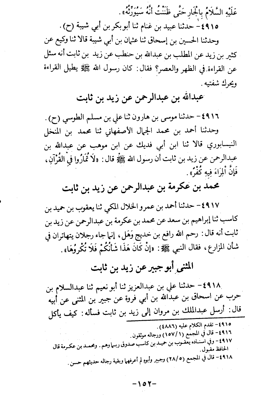 4916 - حَدَّثَنَا مُوسَى بْنُ هَارُونَ، ثنا عَلِيُّ بْنُ مُسْلِمٍ الطُّوسِيُّ، ح وَحَدَّثَنَا أَحْمَدُ بْنُ مُحَمَّدٍ الْجَمَالُ الْأَصْفَهَانِيُّ، ثنا مُحَمَّدُ بْنُ الْمُنَخَّلِ النَّيْسَابُورِيُّ قَالَا: ثنا ابْنُ أَبِي فُدَيْكٍ، عَنِ ابْنِ مَوْهَبٍ، عَنْ عَبْدِ اللهِ بْنِ عَبْدِ الرَّحْمَنِ، عَنْ زَيْدِ بْنِ ثَابِتٍ، أَنَّ رَسُولَ اللهِ صَلَّى اللهُ عَلَيْهِ وَسَلَّمَ قَالَ: «§لَا تُمَارُوا فِي الْقُرْآنِ فَإِنَّ الْمِرَاءَ فِيهِ كُفْرٌ»