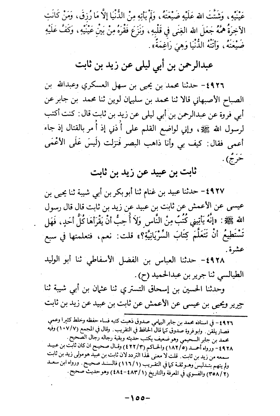 4928 - حَدَّثَنَا الْعَبَّاسُ بْنُ الْفَضْلِ الْأَسْفَاطِيُّ، ثنا أَبُو الْوَلِيدِ الطَّيَالِسِيُّ، ثنا جَرِيرُ بْنُ عَبْدِ الْحَمِيدِ، ح وَحَدَّثَنَا الْحُسَيْنُ بْنُ إِسْحَاقَ التُّسْتَرِيُّ، ثنا عُثْمَانُ بْنُ أَبِي شَيْبَةَ، ثنا جَرِيرٌ، وَيَحْيَى بْنُ عِيسَى عَنِ، الْأَعْمَشِ، عَنْ ثَابِتِ بْنِ عُبَيْدٍ، عَنْ زَيْدِ بْنِ ثَابِتٍ قَالَ: قَالَ لِي رَسُولُ اللهِ صَلَّى اللهُ عَلَيْهِ وَسَلَّمَ: «§يَأْتِينِي كُتُبٌ مِنَ النَّاسِ لَا أُحِبُّ أَنْ يَقْرَأَهَا كُلُّ أَحَدٍ، فَهَلْ تَسْتَطِيعُ أَنْ تَتَعَلَّمَ كِتَابَ السُّرْيَانِيَّةِ؟» قُلْتُ: نَعَمْ قَالَ: «فَتَعَلَّمْتُهَا فِي سَبْعَ عَشْرَةَ»