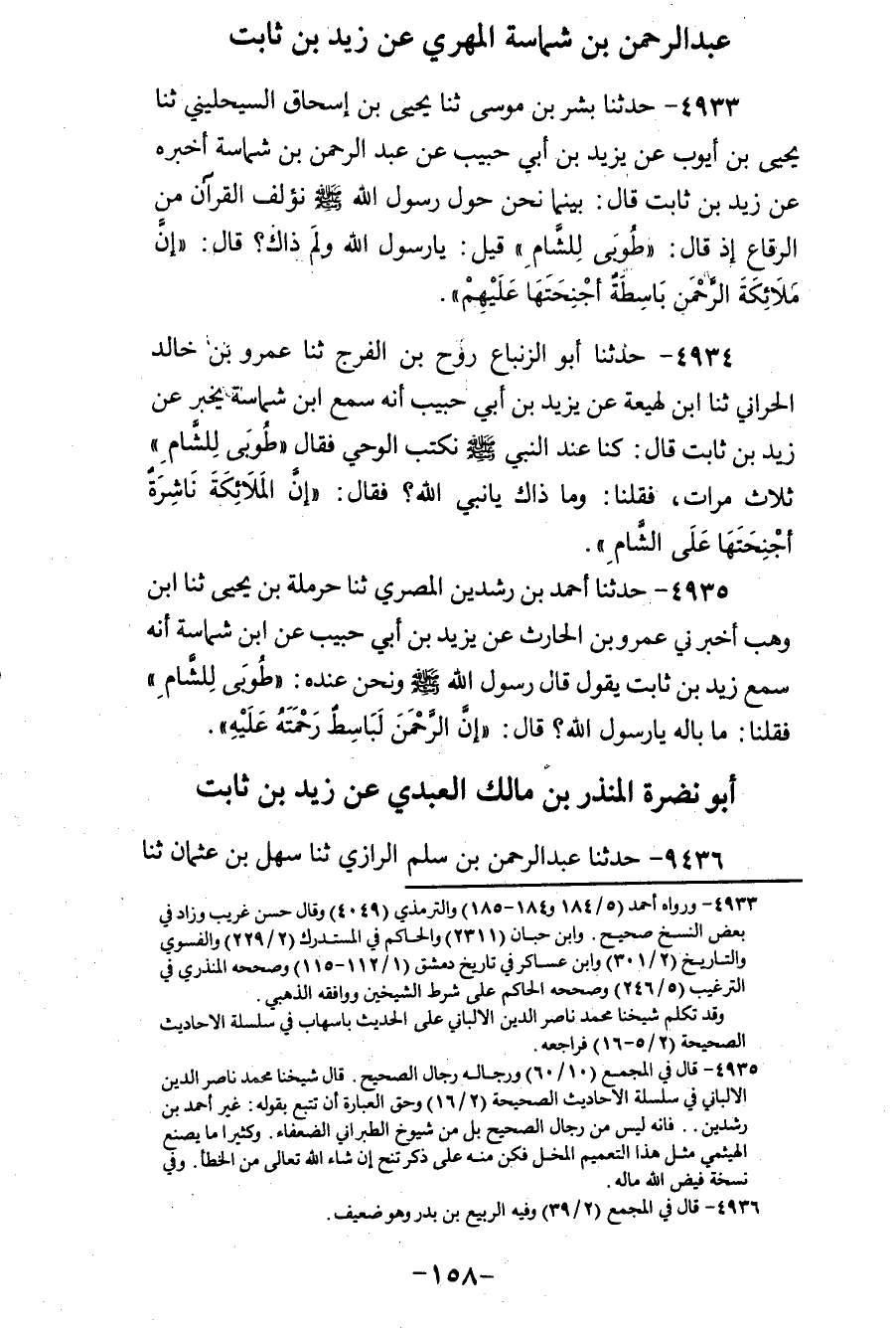 4933 - حَدَّثَنَا بِشْرُ بْنُ مُوسَى، ثنا يَحْيَى بْنُ إِسْحَاقَ السَّيْلَحِينِيُّ، ثنا يَحْيَى بْنُ أَيُّوبَ، عَنْ يَزِيدَ بْنِ أَبِي حَبِيبٍ، عَنْ عَبْدِ الرَّحْمَنِ بْنِ شِمَاسَةَ، أَخْبَرَهُ عَنْ زَيْدِ بْنِ ثَابِتٍ، قَالَ: بَيْنَمَا نَحْنُ حَوْلَ رَسُولِ اللهِ صَلَّى اللهُ عَلَيْهِ وَسَلَّمَ نُؤَلِّفُ الْقُرْآنَ مِنَ الرِّقَاعِ إِذَا قَالَ: «§طُوبَى لِلشَّامِ» قِيلَ: يَا رَسُولَ اللهِ وَلِمَ ذَاكَ؟ قَالَ: «إِنَّ مَلَائِكَةَ الرَّحْمَنِ بَاسِطَةٌ أَجْنِحَتَهَا عَلَيْهِمْ»