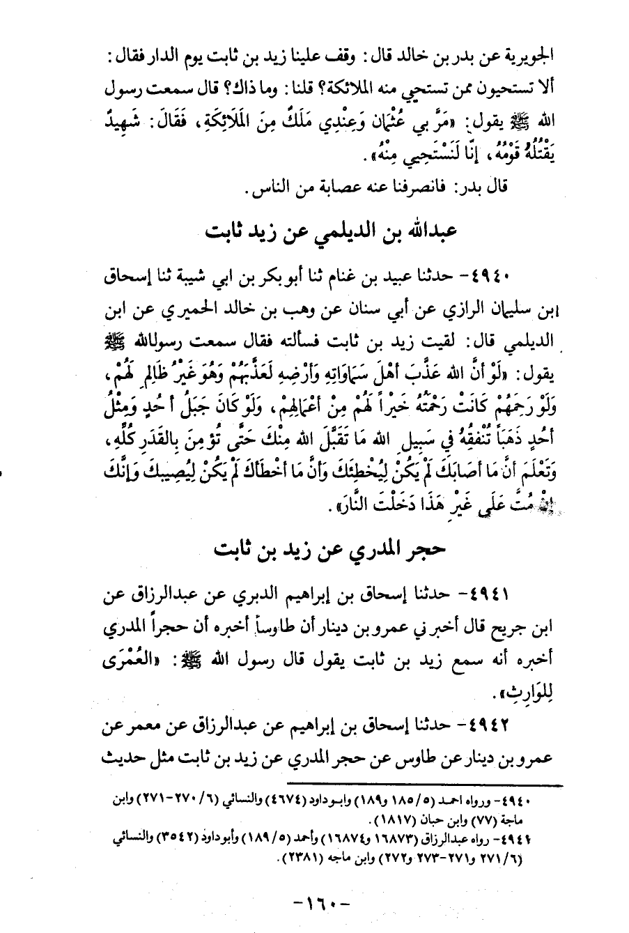 4940 - حَدَّثَنَا عُبَيْدُ بْنُ غَنَّامٍ، ثنا أَبُو بَكْرِ بْنُ أَبِي شَيْبَةَ، ثنا إِسْحَاقُ بْنُ سُلَيْمَانَ الرَّازِيُّ، عَنْ أَبِي سِنَانٍ، عَنْ وَهْبِ بْنِ خَالِدٍ الْحِمْيَرِيُّ، عَنِ ابْنِ الدَّيْلَمِيِّ قَالَ: لَقِيتُ زَيْدَ بْنَ ثَابِتٍ، فَسَأَلْتُهُ، فَقَالَ: سَمِعْتُ رَسُولَ اللهِ صَلَّى اللهُ عَلَيْهِ وَسَلَّمَ يَقُولُ: «§لَوْ أَنَّ اللهَ عَذَّبَ أَهْلَ سَماَوَاتِهِ وَأَرْضَهِ لَعَذَّبَهُمْ وَهُوَ غَيْرُ ظَالِمٍ لَهُمْ، وَلَوْ رَحِمَهُمْ كَانَتْ رَحْمَتُهُ خَيْرًا لَهُمْ مِنْ أَعْمَالِهِمْ، وَلَوْ كَانَ جَبَلُ أُحُدٍ وَمِثْلُ أُحُدٍ ذَهَبًا تُنْفِقُهُ فِي سَبِيلِ اللهِ مَا تَقَبَّلَ اللهُ مِنْكَ حَتَّى تُؤْمِنَ بِالْقَدَرِ كُلَّهِ، وَتَعْلَمَ أَنَّ مَا أَصَابَكَ لَمْ يَكُنْ لِيُخْطِئَكَ وَأَنَّ مَا أَخْطَأَكَ لَمْ يَكُنْ لِيُصِيبَكَ وأَنَّكَ إِنْ مُتَّ عَلَى غَيْرِ هَذَا دَخَلْتَ النَّارَ»