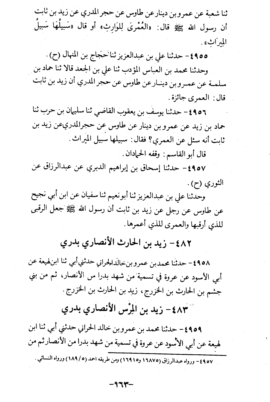 4957 - حَدَّثَنَا إِسْحَاقُ بْنُ إِبْرَاهِيمَ الدَّبَرِيُّ، عَنْ عَبْدِ الرَّزَّاقِ، عَنِ الثَّوْرِيِّ، ح وَحَدَّثَنَا عَلِيُّ بْنُ عَبْدِ الْعَزِيزِ، ثنا أَبُو نُعَيْمٍ، ثنا سُفْيَانُ، عَنِ ابْنِ أَبِي نَجِيحٍ، عَنْ طَاوُسٍ، عَنْ رَجُلٍ، عَنْ زَيْدِ بْنِ ثَابِتٍ، «أَنَّ رَسُولَ اللهِ صَلَّى اللهُ عَلَيْهِ وَسَلَّمَ §جَعَلَ الرُّقْبَى لِلَّذِي أَرْقَبَهَا وَالْعُمْرَى لِلَّذِي أَعْمَرَهَا»