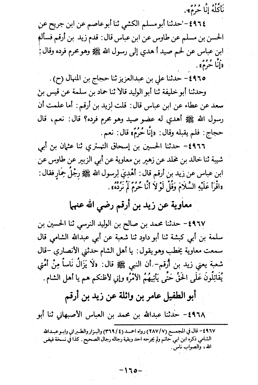 4966 - حَدَّثَنَا الْحُسَيْنُ بْنُ إِسْحَاقَ التُّسْتَرِيُّ، ثنا عُثْمَانُ بْنُ أَبِي شَيْبَةَ، ثنا خَالِدُ بْنُ مَخْلَدٍ، عَنْ زُهَيْرِ بْنِ مُعَاوِيَةَ، عَنْ أَبِي الزُّبَيْرِ، عَنْ طَاوُسٍ، عَنِ ابْنِ عَبَّاسٍ، عَنْ زَيْدِ بْنِ أَرْقَمَ، قَالَ: §أُهْدِيَ لِرَسُولِ اللهِ صَلَّى اللهُ عَلَيْهِ وَسَلَّمَ رِجْلُ حِمَارٍ، فَقَالَ: «اقْرَأْ عَلَيْهِ السَّلَامَ وَقُلْ لَوْلَا أَنَّا حُرُمٌ لَمْ نَرُدَّهُ»