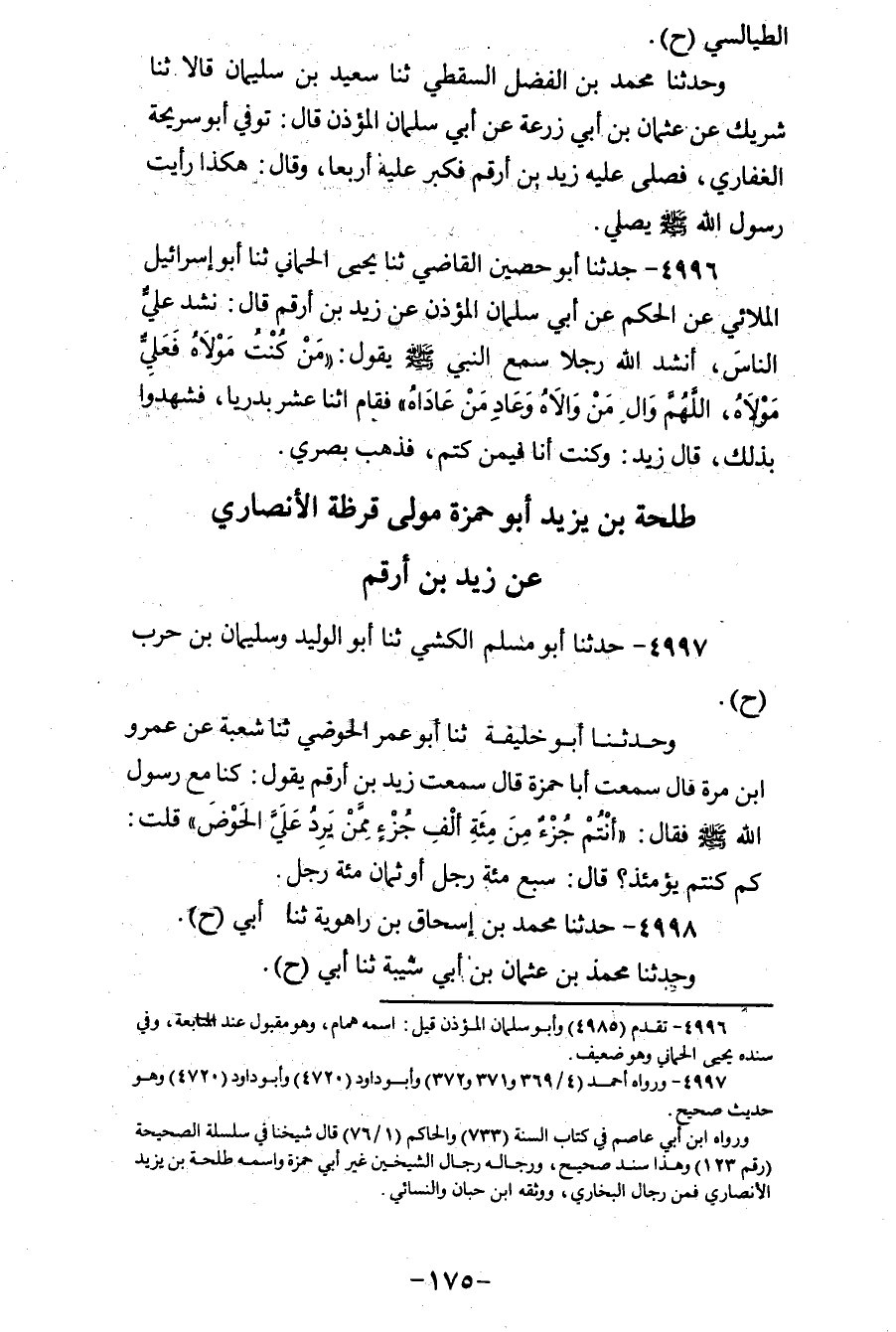 4996 - حَدَّثَنَا أَبُو حُصَيْنٍ الْقَاضِي، ثنا يَحْيَى الْحِمَّانِيُّ، ثنا أَبُو إِسْرَائِيلَ الْمُلَائِيُّ، عَنِ الْحَكَمِ، عَنْ أَبِي سَلْمَانَ الْمُؤَذِّنِ، عَنْ زَيْدِ بْنِ أَرْقَمَ، قَالَ: نَشَدَ عَلِيٌّ، النَّاسَ، أَنْشُدُ اللهَ رَجُلًا سَمِعَ النَّبِيَّ صَلَّى اللهُ عَلَيْهِ وَسَلَّمَ يَقُولُ: «§مَنْ كُنْتُ مَوْلَاهُ فَعَلِيٌّ مَوْلَاهُ اللهُمَّ وَالِ مَنْ وَالَاهُ وَعَادِ مَنْ عَادَاهُ» ، فَقَامَ اثْنَا عَشَرَ بَدْرِيًّا فَشَهِدُوا بِذَلِكَ قَالَ زَيْدٌ: «وَكُنْتُ أَنَا فِيمَنْ كَتَمَ فَذَهَبَ بَصَرِي»