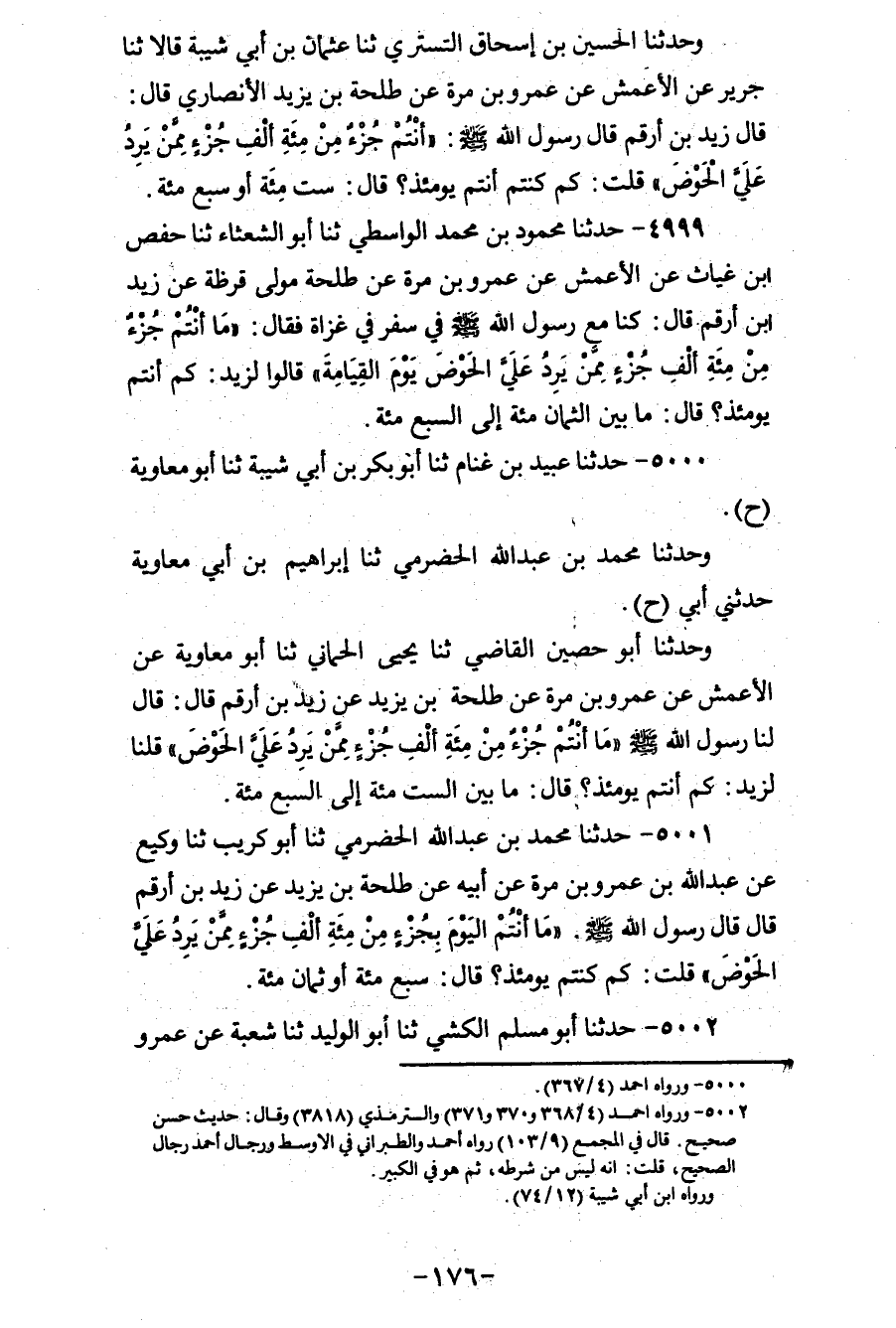 5000 - حَدَّثَنَا عُبَيْدُ بْنُ غَنَّامٍ، ثنا أَبُو بَكْرِ بْنُ أَبِي شَيْبَةَ، ثنا أَبُو مُعَاوِيَةَ، ح وَحَدَّثَنَا مُحَمَّدُ بْنُ عَبْدِ اللهِ الْحَضْرَمِيُّ، ثنا إِبْرَاهِيمُ بْنُ أَبِي مُعَاوِيَةَ، حَدَّثَنِي أَبِي ح، وَحَدَّثَنَا أَبُو حُصَيْنٍ الْقَاضِي، ثنا يَحْيَى الْحِمَّانِيُّ، ثنا أَبُو مُعَاوِيَةَ، عَنِ الْأَعْمَشِ، عَنْ عَمْرِو بْنِ مُرَّةَ، عَنْ طَلْحَةَ بْنِ يَزِيدَ، عَنْ زَيْدِ بْنِ أَرْقَمَ، قَالَ: قَالَ لَنَا رَسُولُ اللهِ صَلَّى اللهُ عَلَيْهِ وَسَلَّمَ: «§مَا أَنْتُمْ جُزْءٌ مِنْ مِائَةِ أَلْفِ جُزْءٍ مِمَّنْ يَرِدُ عَلَيَّ الْحَوْضَ» قُلْنَا لِزَيْدٍ: كَمْ أَنْتُمْ يَوْمَئِذٍ؟ قَالَ: «مَا بَيْنَ السِّتِّ مِائَةِ إِلَى السَّبْعِمِائَةٍ»
