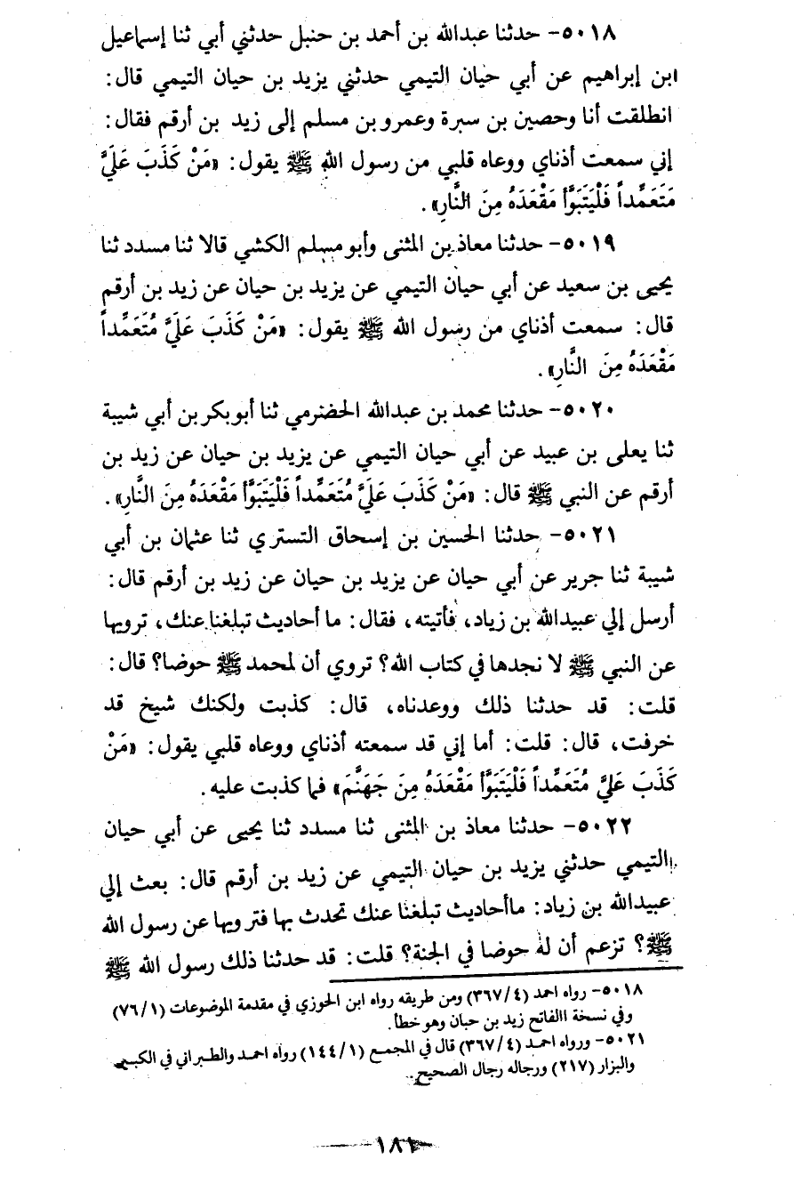 5018 - حَدَّثَنَا عَبْدُ اللهِ بْنُ أَحْمَدَ بْنِ حَنْبَلٍ، حَدَّثَنِي أَبِي، ثنا إِسْمَاعِيلُ بْنُ إِبْرَاهِيمَ، عَنْ أَبِي حَيَّانَ التَّيْمِيِّ، حَدَّثَنِي يَزِيدُ بْنُ حَيَّانَ التَّيْمِيُّ، قَالَ: انْطَلَقْتُ أَنَا وَحُصَيْنُ بْنُ سَبْرَةَ وَعَمْرُو بْنُ مُسْلِمٍ إِلَى زَيْدِ بْنِ أَرْقَمَ، فَقَالَ: إِنِّي سَمِعَتْ أُذُنَاي وَوَعَاهُ قَلْبِي مِنْ رَسُولِ اللهِ صَلَّى اللهُ عَلَيْهِ وَسَلَّمَ يَقُولُ: «§مَنْ كَذَبَ عَلَيَّ مُتَعَمِّدًا فَلْيَتَبَوَّأْ مَقْعَدَهُ مِنَ النَّارِ»