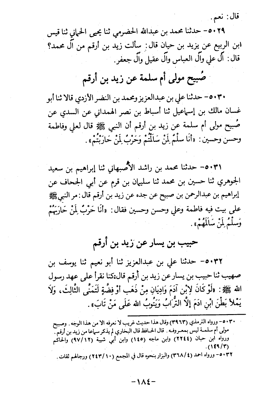 5029 - حَدَّثَنَا مُحَمَّدُ بْنُ عَبْدِ اللهِ الْحَضْرَمِيُّ، ثنا يَحْيَى الْحِمَّانِيُّ، ثنا قَيْسُ بْنُ الرَّبِيعِ، عَنْ يَزِيدَ بْنِ حَيَّانَ، قَالَ: سَأَلْتُ زَيْدَ بْنَ أَرْقَمَ، §مَنَ آلُ مُحَمَّدٍ؟ قَالَ: «آلُ عَلِيٍّ وَآلُ الْعَبَّاسِ وَآلُ عَقِيلٍ وَآلُ جَعْفَرٍ»