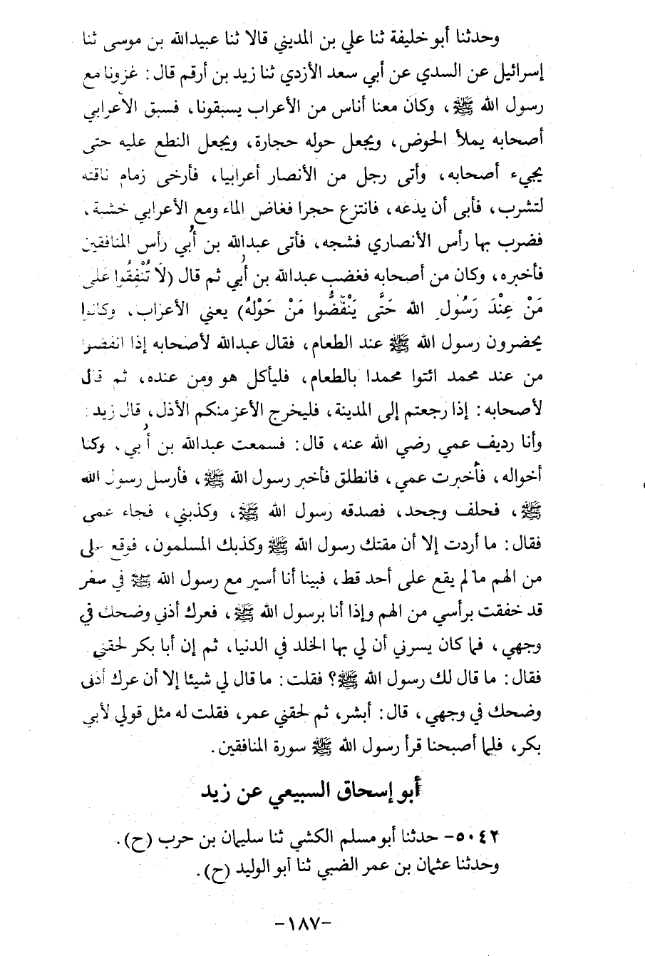 5042 - حَدَّثَنَا أَبُو مُسْلِمٍ الْكَشِّيُّ، ثنا سُلَيْمَانُ بْنُ حَرْبٍ، ح وَحَدَّثَنَا عُثْمَانُ بْنُ عُمَرَ الضَّبِّيُّ، ثنا أَبُو الْوَلِيدِ، ح وَحَدَّثَنَا أَبُو خَلِيفَةَ، ثنا أَبُو الْوَلِيدِ، وَمُحَمَّدُ بْنُ كَثِيرٍ، قَالُوا: ثنا شُعْبَةُ، عَنْ أَبِي إِسْحَاقَ، قَالَ: خَرَجَ النَّاسُ يَسْتَسْقُونَ وَخَرَجَ فِيهِمْ زَيْدُ بْنُ أَرْقَمَ، فَدَنَوْتُ إِلَيْهِ، فَقُلْتُ: §كَمْ غَزَا رَسُولُ اللهِ صَلَّى اللهُ عَلَيْهِ وَسَلَّمَ؟ قَالَ: «تِسْعَ عَشْرَةَ غَزْوَةً» ، قُلْتُ: كَمْ غَزَوْتَ مَعَهُ؟ قَالَ: «سَبْعَ عَشْرَةَ غَزْوَةً» ، قَالَ: «وَصَلَّى بِالنَّاسِ رَكْعَتَيْنِ» - زَادَ أَبُو الْوَلِيدِ فِي حَدِيثِهِ - قُلْتُ: مَا أَوَّلُ مَا غَزَا رَسُولُ اللهِ صَلَّى اللهُ عَلَيْهِ وَسَلَّمَ؟ قَالَ: «ذَا الْعَشِيرَةِ أَوْ ذَا الْعُسَيْرَةِ»