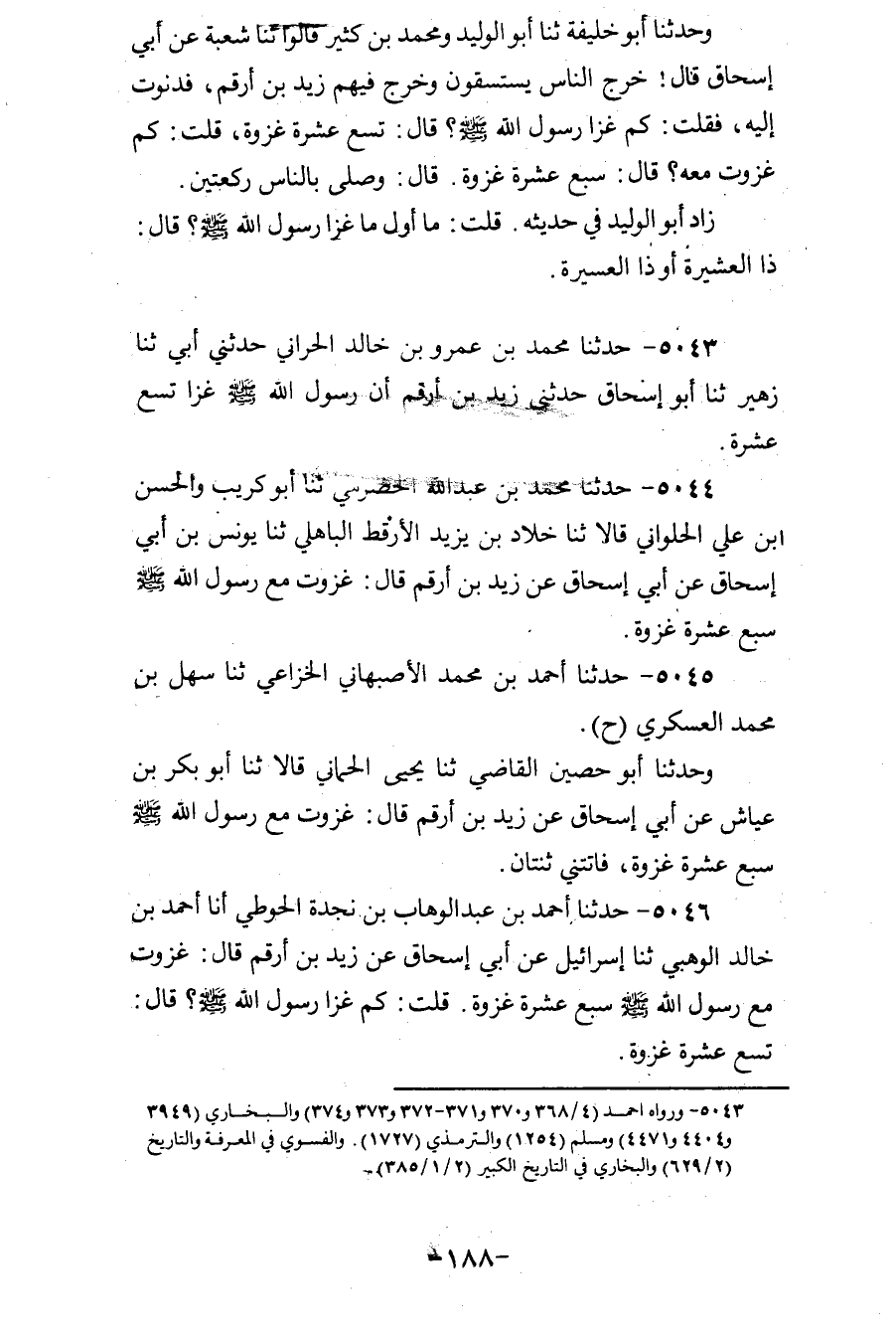 5043 - حَدَّثَنَا مُحَمَّدُ بْنُ عَمْرِو بْنِ خَالِدٍ الْحَرَّانِيُّ، حَدَّثَنِي أَبِي، ثنا زُهَيْرٌ، ثنا أَبُو إِسْحَاقَ، حَدَّثَنِي زَيْدُ بْنُ أَرْقَمَ، «أَنَّ رَسُولَ اللهِ صَلَّى اللهُ عَلَيْهِ وَسَلَّمَ §غَزَا تِسْعَ عَشْرَةَ»