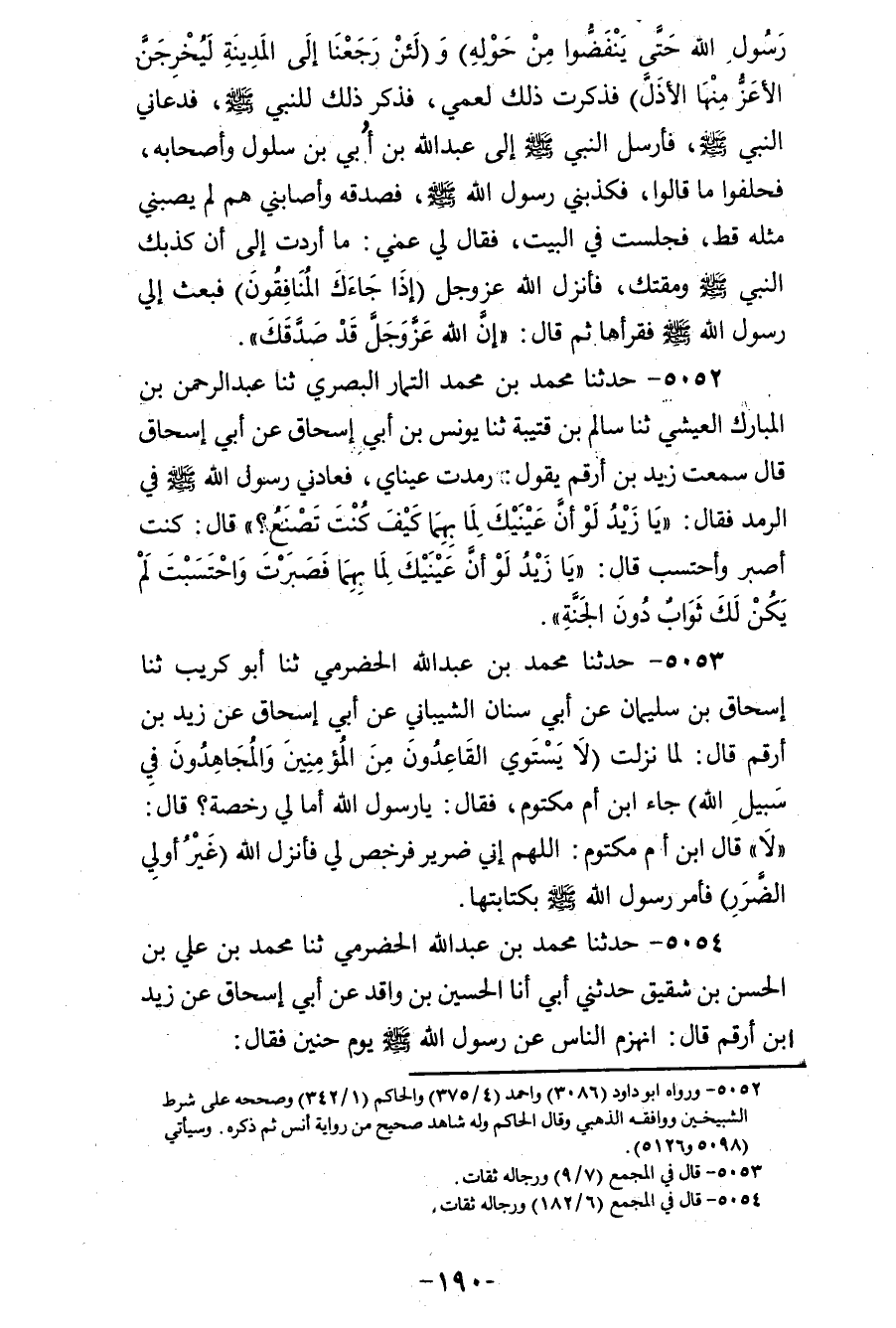 5053 - حَدَّثَنَا مُحَمَّدُ بْنُ عَبْدِ اللهِ الْحَضْرَمِيُّ، ثنا أَبُو كُرَيْبٍ، ثنا إِسْحَاقُ بْنُ سُلَيْمَانَ، عَنْ أَبِي سِنَانٍ الشَّيْبَانِيِّ، عَنْ أَبِي إِسْحَاقَ، عَنْ زَيْدِ بْنِ أَرْقَمَ، قَالَ: لَمَّا نَزَلَتْ {§لَا يَسْتَوِي الْقَاعِدُونَ مِنَ الْمُؤْمِنِينَ} [النساء: 95] {وَالْمُجَاهِدُونَ فِي سَبِيلِ اللهِ} [النساء: 95] جَاءَ ابْنُ أُمُّ مَكْتُومٍ، فَقَالَ: يَا رَسُولَ اللهِ أَمَا لِي رُخْصَةٌ؟ قَالَ: «لَا» قَالَ ابْنُ أُمِّ مَكْتُومٍ: اللهُمَّ إِنِّي ضَرِيرٌ فَرَخَّصْ لِي فَأَنْزَلَ اللهُ {غَيْرٌ أُولِي الضَّرَرِ} [النساء: 95] فَأَمَرَ رَسُولُ اللهِ صَلَّى اللهُ عَلَيْهِ وَسَلَّمَ بِكِتَابَتِهَا